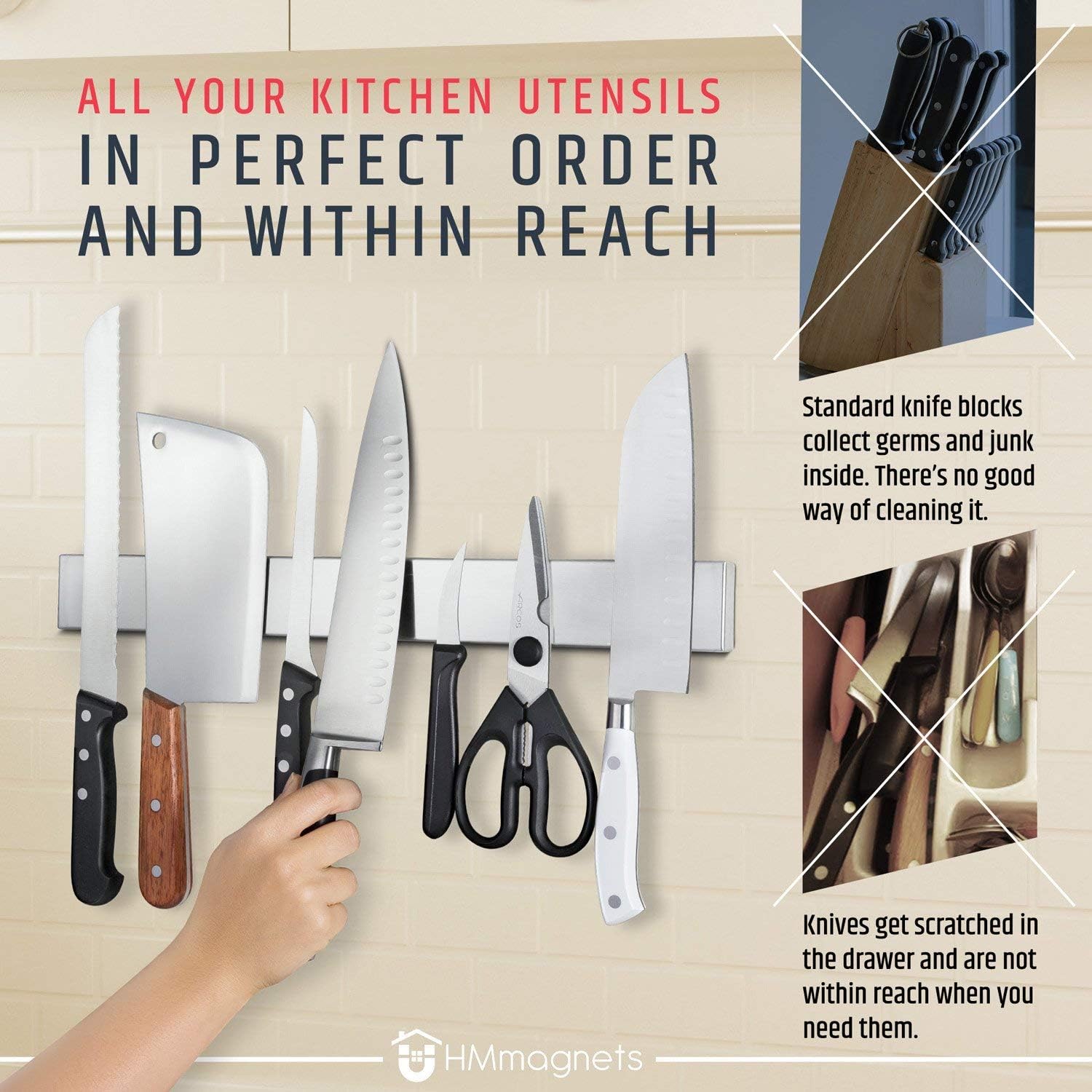• PRODUCT 1 – 17" STAINLESS STEEL KNIFE HOLDER: We bring you a *NEW, UPGRADED* 17" knife bar, now including *HEAVY-DUTY MAGNETS* which will never lose their magnetic force. This update provides you with a high quality magnetic knife strip that holds your entire knife set securely and in easy reach. Our chosen magnet has an even magnetic force across the bar allowing you to safely use the entire 17” length. The magnetic grip is very powerful, yet it only takes a gentle tug to release any knife!