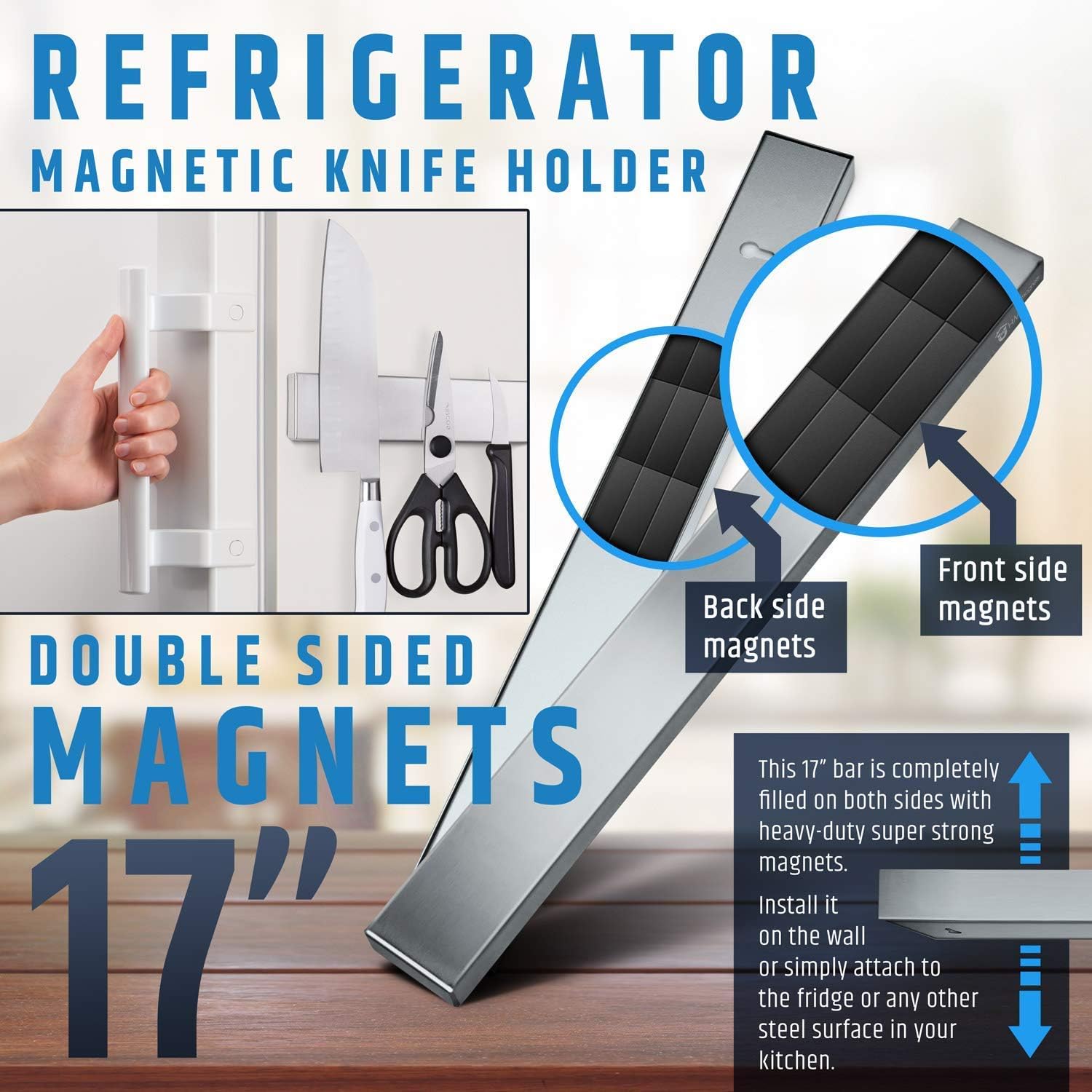 • PRODUCT 2 - FRIDGE MAGNET KNIFE HOLDER: Unlike our original knife bar (red package), this *NEW, UPGRADED* 17" stainless steel knife bar (blue package), is *DOUBLE SIDED* with heavy-duty magnets on both sides, which can either be attached to the wall or simply to your refrigerator *WITHOUT ANY INSTALLATION*. This update provides you with a high quality magnetic knife strip that holds your entire knife set securely and in easy reach on the side of your fridge in your kitchen.