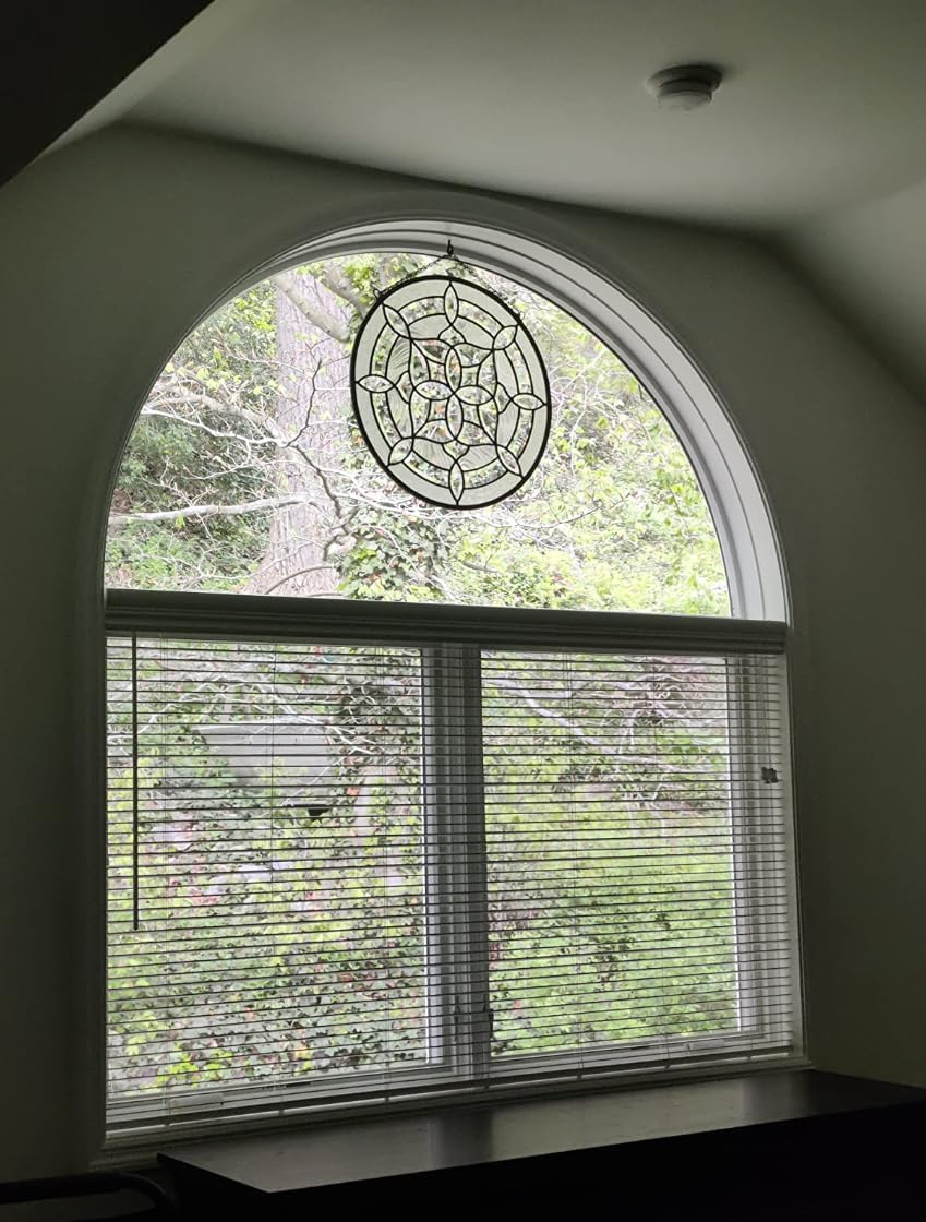 This is for a beautiful handmade all clear hanging glass window panel . This is an elegant designed panel, it would be an enhancement to any window or sun porch, or bay window. copper frame. using zinc came method. Came works better in windows with lots of longer, straight lines, Came is best suited for crisp hard line work. detail is great and in perfect condition, size is about 21" Dia. This panel comes with chain. We also have more window panels in my store, Please check our store for more windows. Don't let it pass you by!