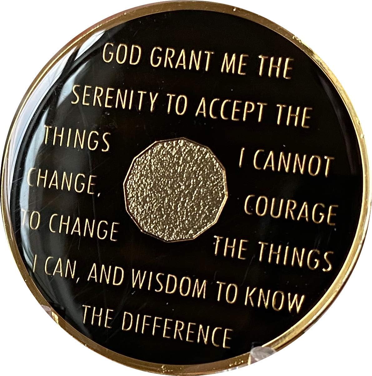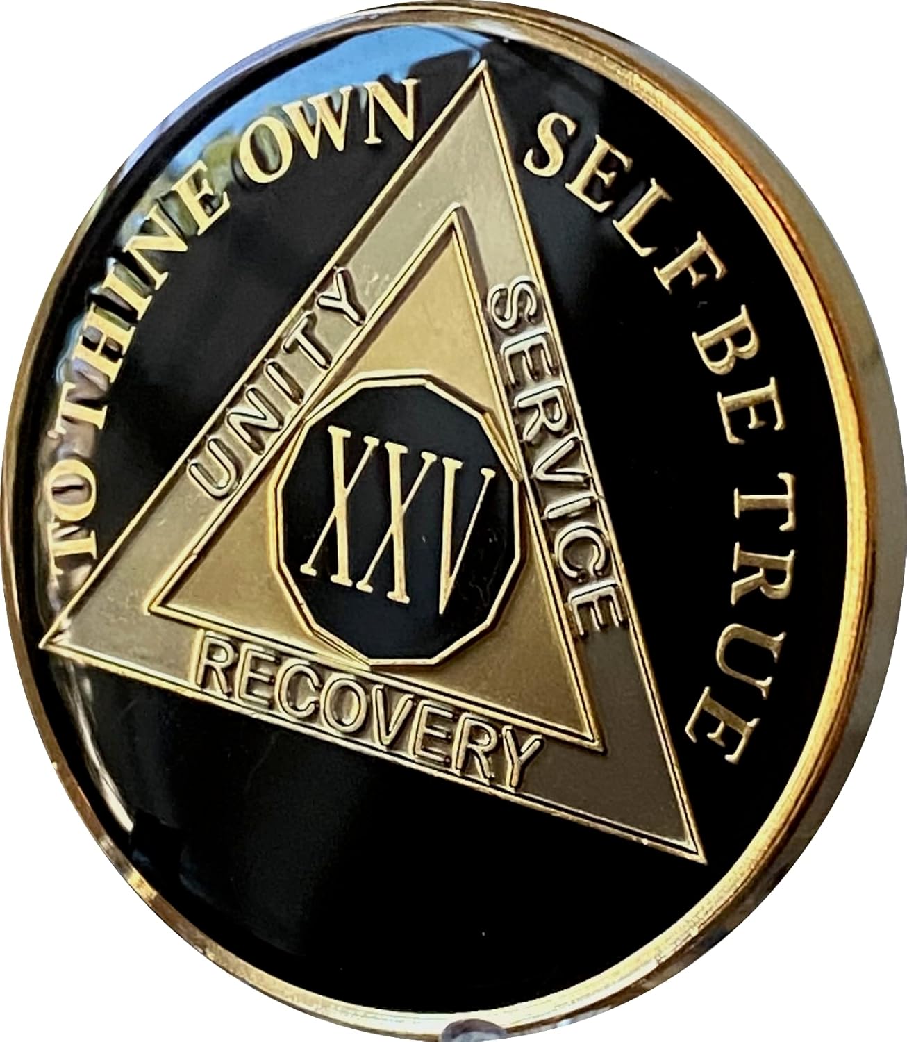 This is a stunning 25 Year AA Alcoholics Anonymous Medallion Chip made by Bright Star Press. The color is called Classic Black and what is so amazing is how it turns color in various light. It changes from a glossy black to a flatt black when you move it in light so cool! The chip is Tri-Plate gold and nickel plated. Front has the three legacies triangle and Unity Service Recovery and To Thine Own Self Be True. Back has the serenity prayer. Note picture is a sample yours will have XXX on it for 30 Years.