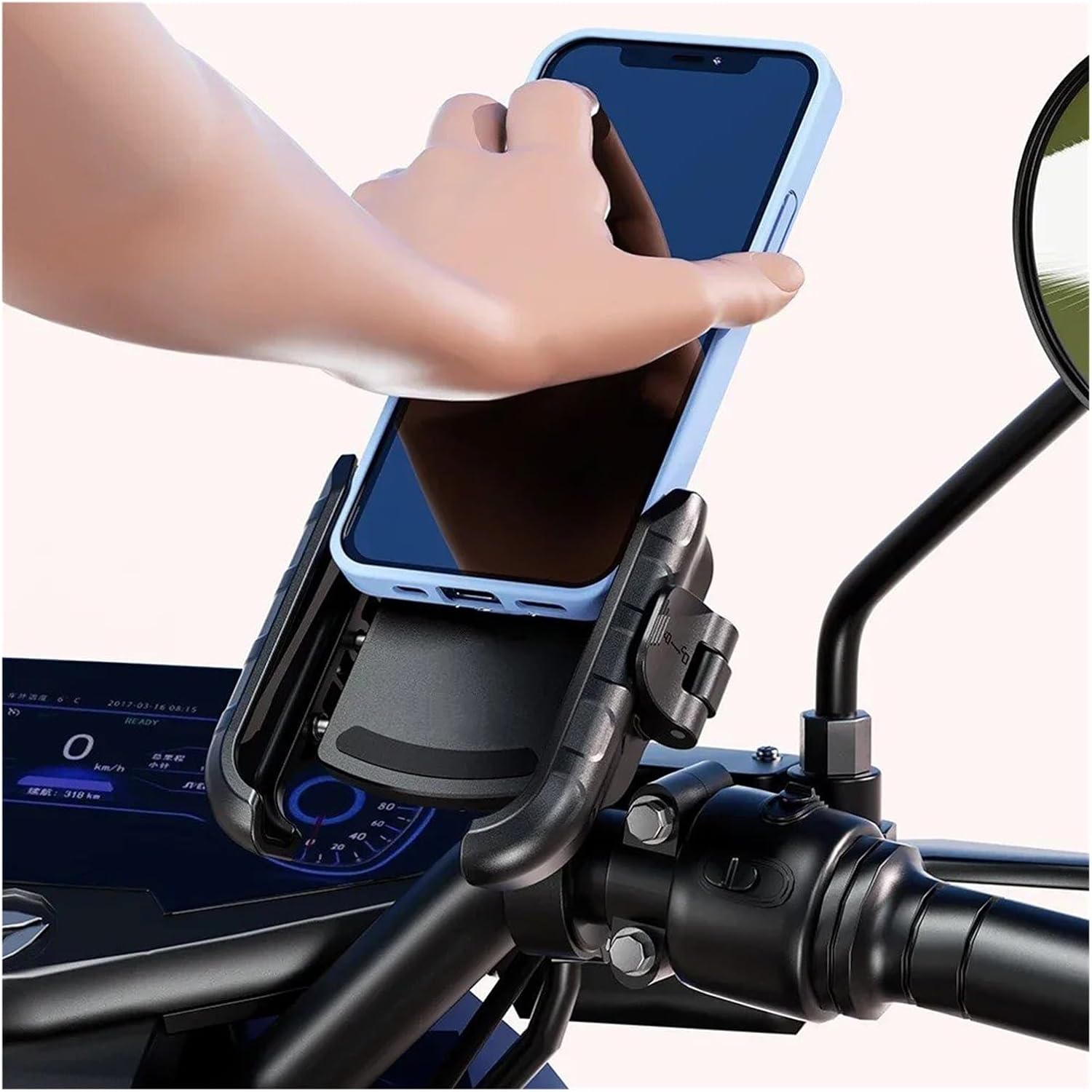 "DescriptionReport ItemSpecifications:Material : The main structure made from PA66+GF and the handlebar mounting base are made from aluminium alloy to make sure it's absolutely safe and sturdy.Anti-slip mats: protect your phone, avoid shaking and skiddingSuitable diameter for handle: 22-25-32mmCompatible with phone size:5.4"-7.2" smartphonesWhen mounting for the first time, you only need to insert your cell phone, turn the switch and adjust the holder to the correct width. By turning the switch on and off, the cell phone can be attached or removed in 1s. You can capture the beautiful moments of your trip at any time."