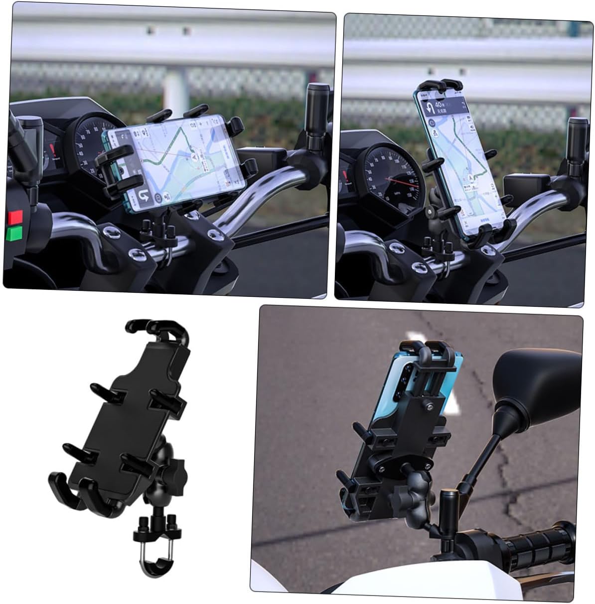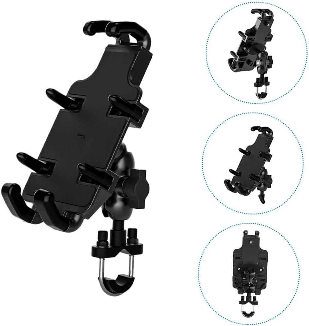 Package Include 1 set x phone holder Features - Color: Black. - Material: Aluminum and PC. - Size: 15.10 x 7.90 x 5.00cm/ 5.93 x 3.10 x 1.97 inch. -Product Info:Electric motorcycle mobile phone stand - Simply adjust and secure your phone in any angle and position. Professional and practical design with beautiful appearance, easy to carry and use Phone Support. - Rubber pads can reduce Smartphone vibration and prevent GPS Navigation Bracket. - You can adjust the suitable size with your phone by the gear, and also press the release bars to remove your phone with one simple hand motion. - Aluminum base clamp arm can rotated and adjusted 360 degree to your unique viewing angle Phone Mount Clip. - Do not need to worry about your phone falling off the motorcycle while using the GPS Motorbike Phone Mount.Goods DescriptionPhone Mount Holder Devices 360-degree rotation, flexible and convenient to use anti-slips mats, protect your phone, avoid shaking and skidding.Phone Support It can make you enjoy music easily when you are outriding, and you can also guide you by navigation.Phone Mount Clip Widely compatible with many cell phones used for handlebar of motorcycle