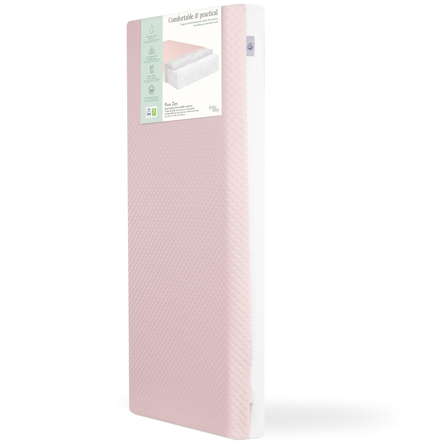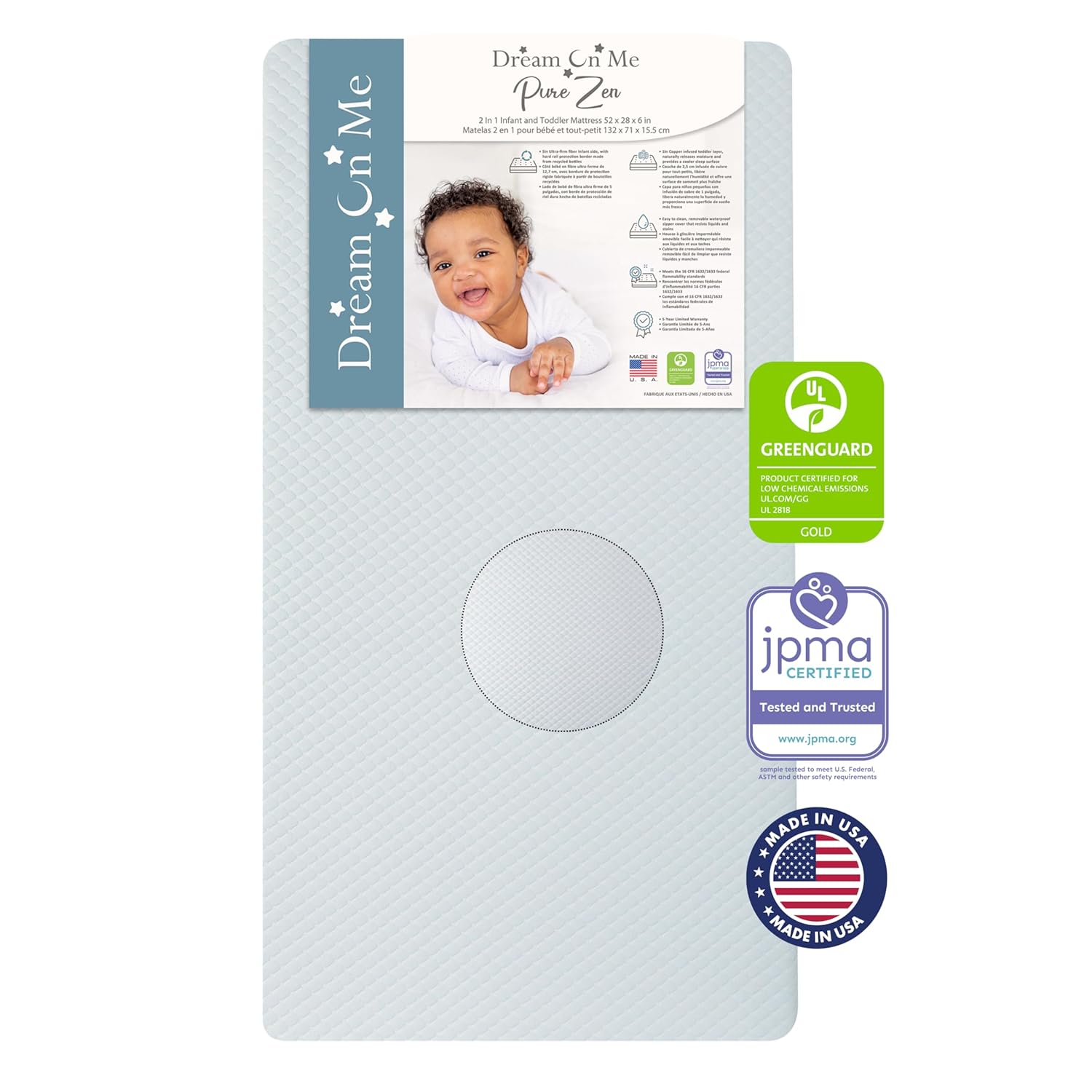 Create a safe, supportive sleep space that grows with your child using the Dream On Me Wildflower 2-in-1 Crib & Toddler Mattress. Thoughtfully designed for infants and toddlers, this dual-sided mattress offers the ideal balance of firm support and gentle comfort through every stage of early development. The infant side (0–12 months) features an ultra-firm fiber core that provides strong, even support recommended for safer newborn sleep. As your child grows, simply flip the mattress to the toddler side (12 months+), which includes a 1" copper-infused comfort layer designed to help release moisture and maintain a comfortable sleep temperature for more restful nights. Sized at 52” L x 28” W x 5” H, it fits standard full-size cribs and toddler beds for a snug, secure fit. The water-resistant surface helps protect against everyday leaks and messes, while the removable, machine-washable cover keeps your baby’s sleep space clean, fresh, and hygienic. Proudly made in the USA, the Wildflower mattress is GREENGUARD Gold Certified and Baby Safety Alliance Verified, meeting ASTM and CPSC safety standards for trusted quality and a healthier sleep environment. Built with durable construction and backed by a 7-Year Limited Manufacturer’s Warranty, it’s a reliable sleep solution families can depend on.
