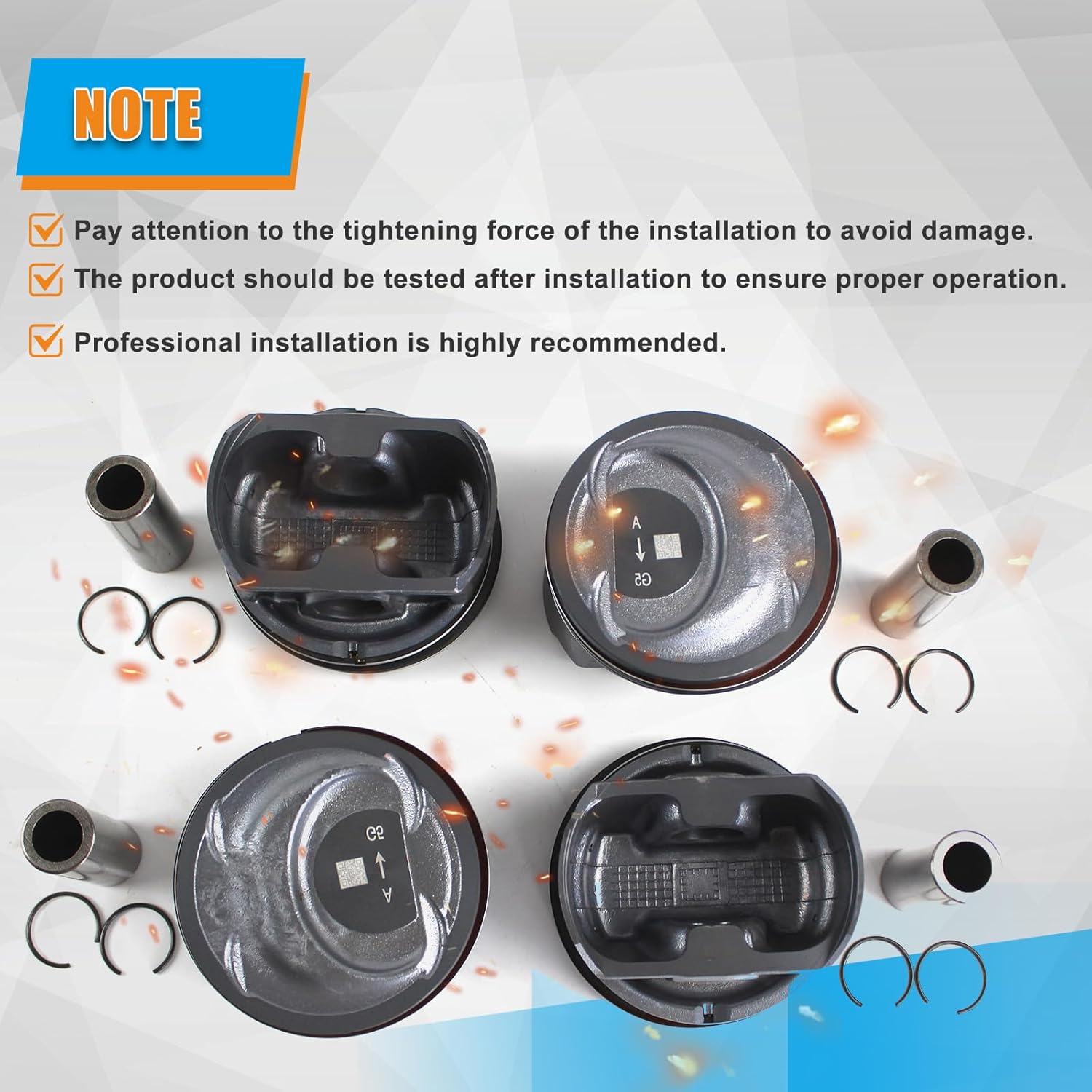 FIWARY Engine Piston Set | Premium Replacement for Hyundai/Kia 2.4L GDI & Alpina 4.4L V8 Engines Features: Complete Kit for Engine Rebuild: Includes all four pistons, matching piston pins, and a full set of piston rings. This comprehensive package ensures component harmony and simplifies the sourcing process for a professional-grade rebuild. Precision Engineered for Exact Fit: Each piston is manufactured to strict OEM tolerances for diameter, skirt profile, and compression height. This guarantees a perfect fit within the cylinder bore, ensuring proper clearance and optimal performance. Restores Engine Performance & Efficiency: Worn pistons and rings can cause oil consumption, loss of power, and low compression. This new set helps restore factory compression, improve sealing, and contribute to regained engine power and fuel economy. Durable Construction for Longevity: Made from high-quality aluminum alloy, these pistons are designed to withstand the high heat and pressure conditions within the combustion chamber, offering reliable and durable service life. Specifications: Product Type: Engine Piston Set (Pistons, Pins, Rings) Condition: 100% Brand New Warranty: 12-Month Limited Warranty Compatible Vehicles: This piston set is engineered for the following applications. Always verify your vehicle's exact year, model, trim, and engine code before purchasing. Hyundai Sonata (2011-2013): 2.4L 2359cc L4 DOHC (Gasoline & Hybrid variants) Kia Optima (2011-2013): 2.4L 2359cc L4 DOHC (Gasoline & Hybrid variants) Kia Sorento (2011-2013): 2.4L 2359cc L4 DOHC Alpina B7 xDrive (2011-2012) F01/F02: 4.4L V8 DOHC Twin-Turbo OE Part Numbers Replaced: This set directly replaces OEM part numbers 23040-2G500 and 23410-2G500. Package Contents: 4 x Engine Pistons 4 x Engine Piston Pins 1 x Set of Piston Rings (for all cylinders)