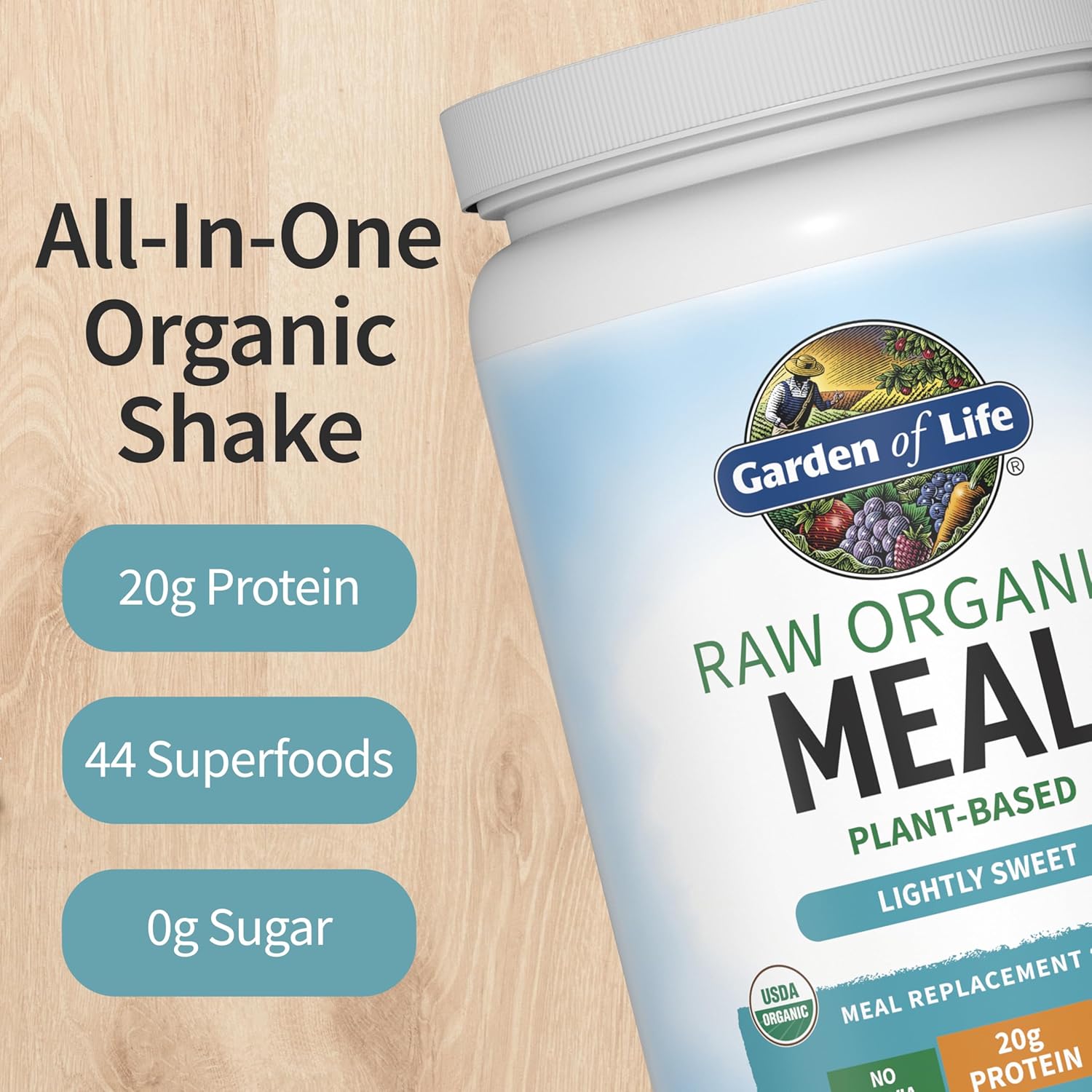 Garden of Life Raw Organic Meal Replacement delivers complete nutrition in every scoop, featuring 20g of clean, plant-based protein from organic peas and sprouted grains. This lightly sweetened powder combines the perfect balance of protein, fiber, and nutrients with only 150 calories per serving, making it an ideal meal replacement for busy, health-conscious individuals. Our unique blend includes organic sprouted ingredients like quinoa, chia, and flax seeds, plus a comprehensive mix of organic fruits and vegetables for whole food nutrition. Enhanced with live probiotics and digestive enzymes, including Bacillus subtilis DE111, this formula supports optimal digestion and nutrient absorption. The powder is processed at low temperatures to preserve the natural benefits of its ingredients, ensuring you get the most from every serving. Made without dairy, soy this USDA Organic meal replacement perfectly aligns with vegan and gluten-free lifestyles. Simply mix one scoop with 8 oz of cold water or your favorite plant-based milk for a smooth, delicious shake that provides sustained energy throughout your day.