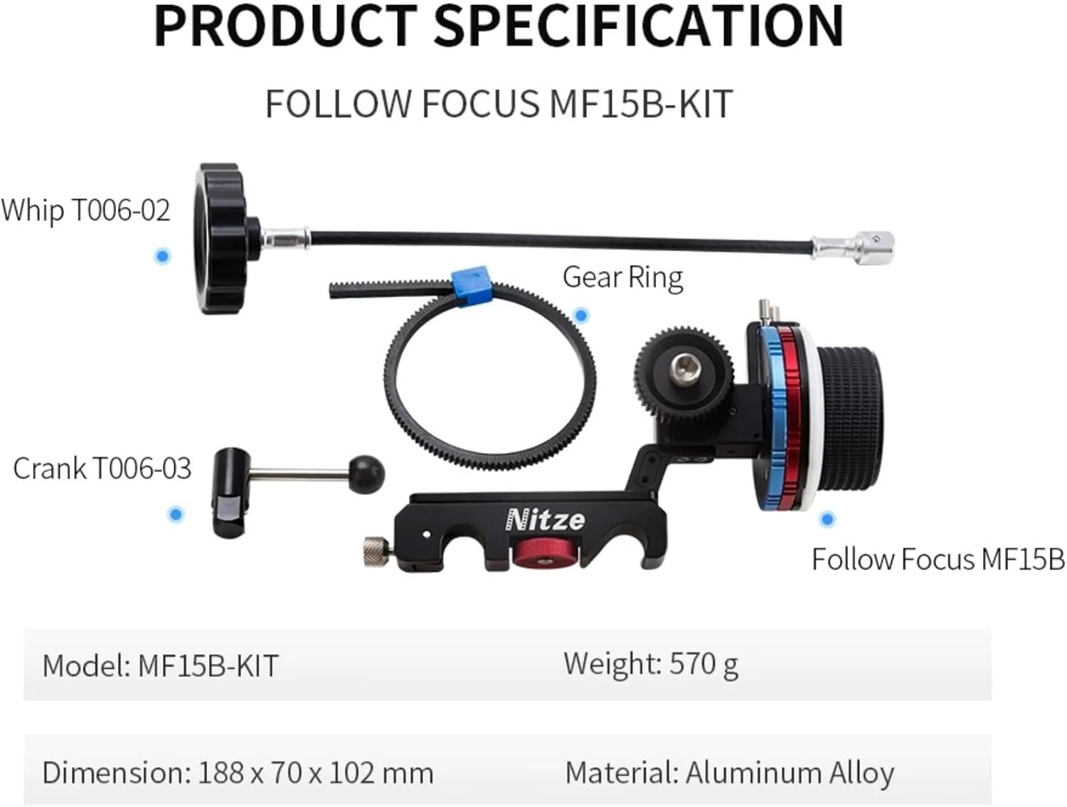 | BuiltIn Media | 1 x Gear Ring, 1 x MF15B Follow Focus, 1 x T006-02 10”Whip, 1 x T006-03 Crank |