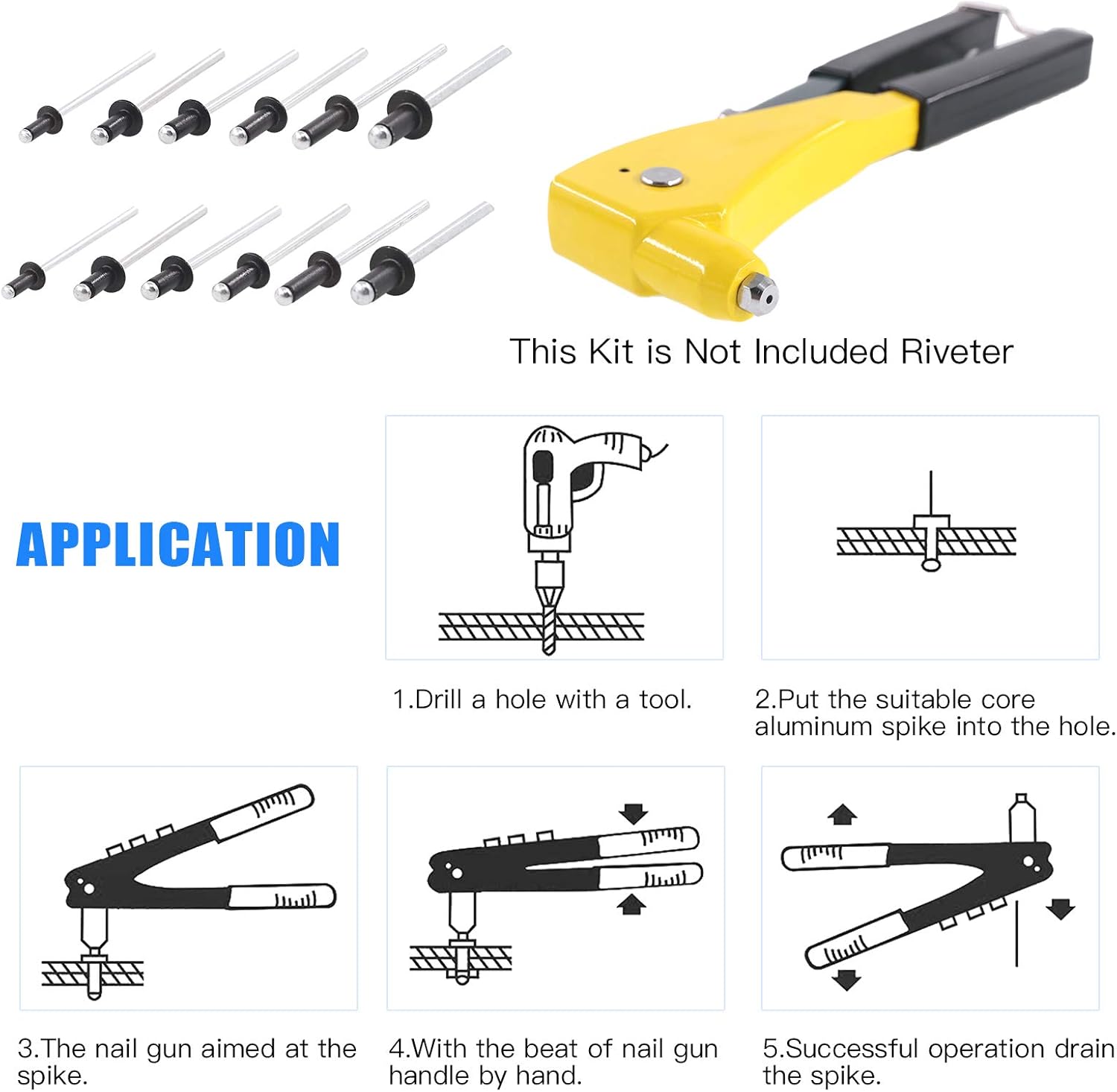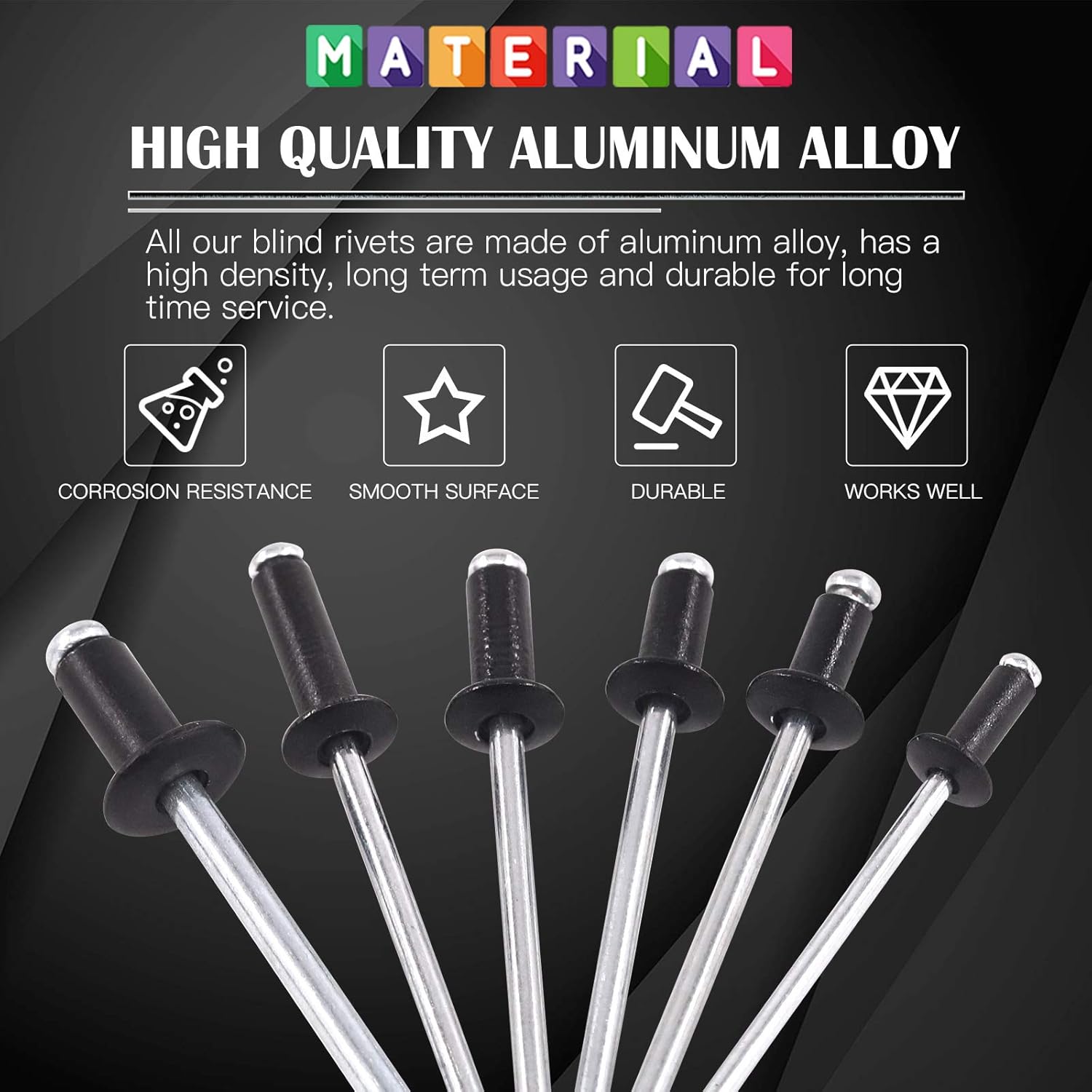 Glarks 120Pcs M3.2x6.4mm Black Blind Rivets Aluminum Pop Rivets for Sheet Metal, Automotive, Railway, and Furnitures Specification: Product Type: Blind pop rivets Material: Aluminum Color: Black+ Silver Rivets Diamater: 3.2mm Rivets Length: 6.4mm Insert Tool: Automatic riveting machine, rivet bucker, rivet gun. Package Include: M3.2x6.4mm pop rivets x 120Pcs Choose Us: ♛ Made of red copper and aluminum alloy, acid and corrosion resistance. ♛ Surface is smooth, strong yet lightweight. ♛ Easy to install, match well with the rivet gun. ♛ Great for joining all kinds of metal plate and pipe. ♚ Note: Please read the second picture for specific size. Manual measurement, there may be errors, please don't mind. ♚ Quality Assurance: If you receive a defective product or have any problems during use, please feel free to contact us, we will provide return and exchange service at any time.
