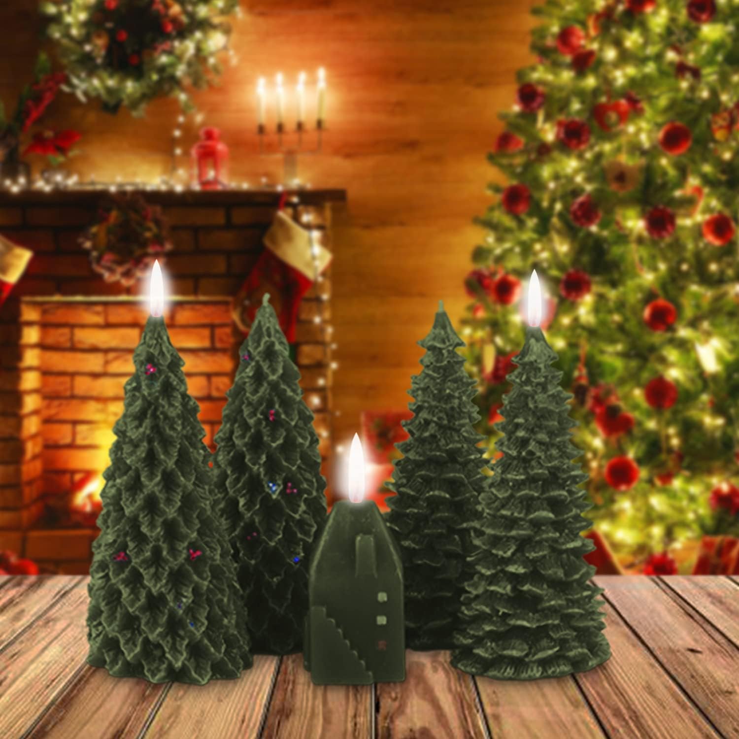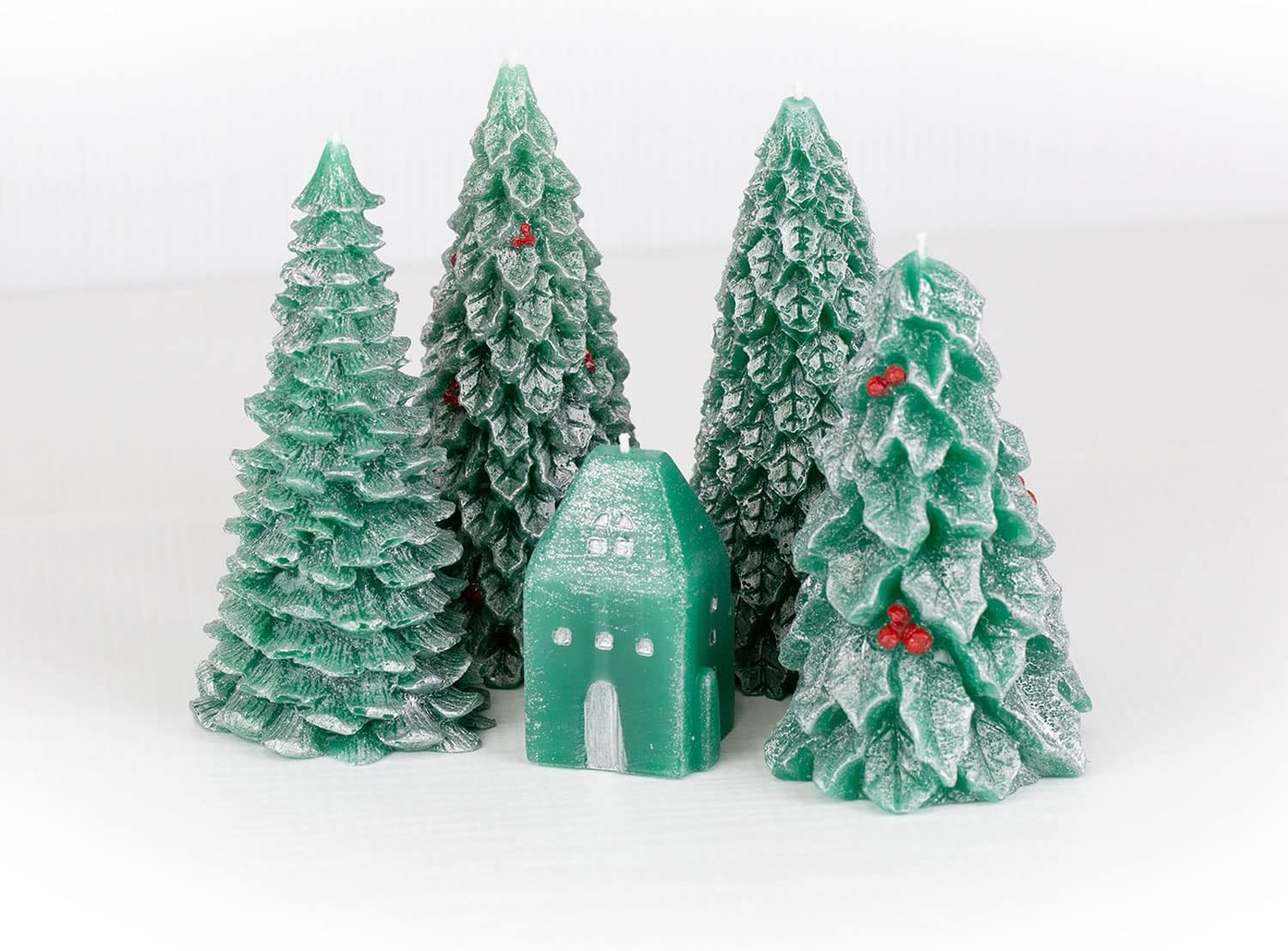 Introducing our HANDMADE paraffin wax Green Christmas tree shaped pillar candles in a convenient set of 5. 3 of them 5.50x2.75 inch, one 4.50x2.75 inch and house 1.5x2.75 inch pillar candle is made with lead-free and 100% cotton wicks, ensuring a clean and smoke-free burn every time. Each candle, scented or unscented, is crafted with the highest quality paraffin wax and care. Perfect for any occasion, our unscented or scented pillar candles are a versatile choice for Weddings, Birthdays, Anniversaries, Housewarming, Halloween, Thanksgiving, Christmas, Valentine's Day, or Mother's Day. With a long-lasting 60 hour burn time, you can enjoy the warm glow of our candles for hours on end. Plus, you can feel good about supporting a local business - all of our candles are proudly MADE in the USA. To ensure your candles arrive in perfect condition, we individually wrap each pillar candle in bubble wrap before packaging. For the best results, we recommend burning each pillar candle for 3 hours on the first burn. Always use an appropriate candle holder and place candles on a stable, heat-resistant surface away from drafts and flammable materials. Keep the wick trimmed to approximately ¼ inch before each use and never move the candle while burning or if the wax is hot. Also, never place candles directly on furniture surfaces and never leave a burning candle unattended. Thank you for choosing our handmade Green Christmas tree shaped pillar candles. Shop with confidence knowing that each candle is crafted with the highest quality paraffin wax and love.
