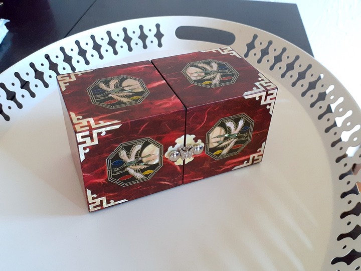 Exquisite wooden jewelry box handmade in Korea using the Najeon Chilgi technique. Made of polished wood inlaid with mother of pearl designs. The two halves unfold and open up to reveal small drawers. Brand new, in original box.