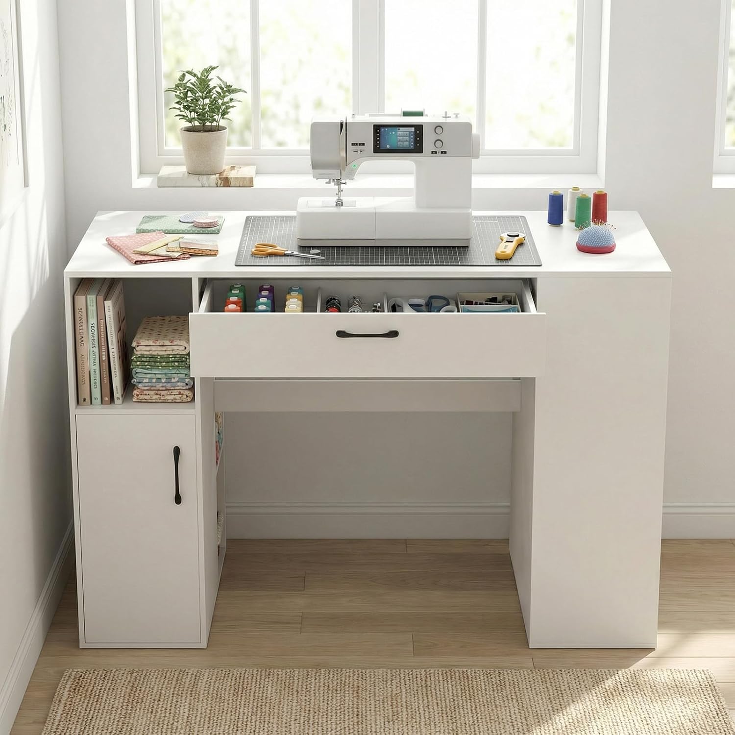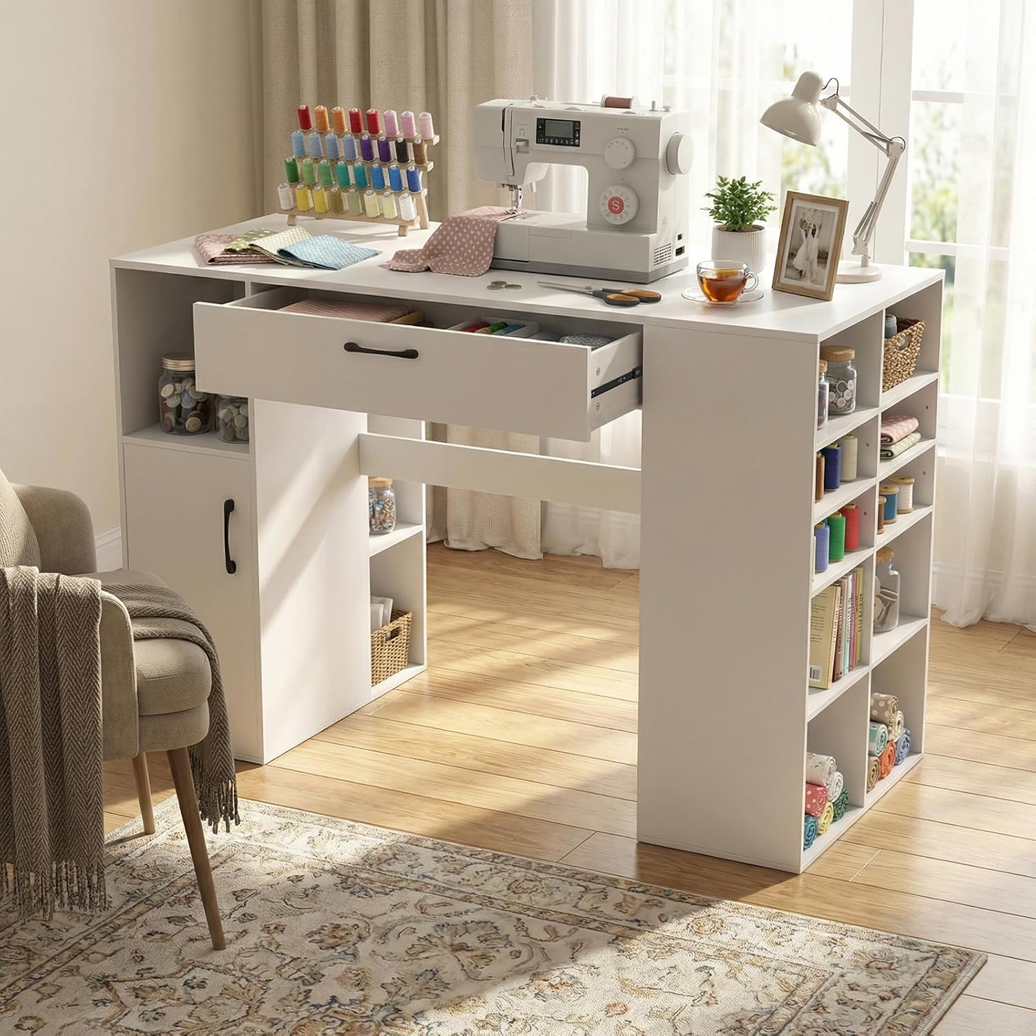 Description: Upgrade your creative space with this versatile sewing desk. Measuring 53" wide, it provides a spacious surface for sewing, crafting, or studying. Featuring 14 open cubbies, a large drawer, and two adjustable shelves, it keeps supplies organized and easily accessible. Built to support up to 265 lbs, this sturdy table includes smooth drawers and magnetic door catches for added convenience and durability. Features: 14 open compartments for organizing sewing supplies Two-tier cabinet with door for bulkier items Pull-out drawer perfect for small accessories Two adjustable shelves for varied storage needs Large 53" tabletop ideal for multiple uses Reinforced crossbar for added stability Smooth drawer slides with easy-grip knobs Magnetic door catches secure cabinet doors Doubles as a study or craft desk Only the second shelf in side compartments is adjustable Assembly required Specifications: Color: White Material: Engineered Wood & MDF Overall Size: 53" L x 24" W x 36" H (135 x 60 x 91 cm) Drawer: 27.5" x 11.5" x 4" (70 x 28.5 x 9.5 cm) Open Shelf: 11" x 14.5" x 12.5" (27.5 x 36 x 31 cm) Cabinet Shelf: 11" x 14.5" x 11" (27.5 x 36 x 28 cm) Large Compartment: 11" x 11.5" x 10" (27.5 x 28 x 25 cm) Small Compartment: 11" x 11.5" x 6.5" (27.5 x 28 x 16.5 cm) Back Compartment: 8" x 11.5" x 11" (20.5 x 28.5 x 28 cm) Net Weight: 123 lbs (56 kg) Tabletop Capacity: 265 lbs (120 kg) Drawer Capacity: 25 lbs (10 kg) Left Compartments Capacity: 45 lbs (20 kg) each Right Compartments Capacity: 25 lbs (10 kg) each Package Includes: 1 x Sewing Desk 1 x User Manual