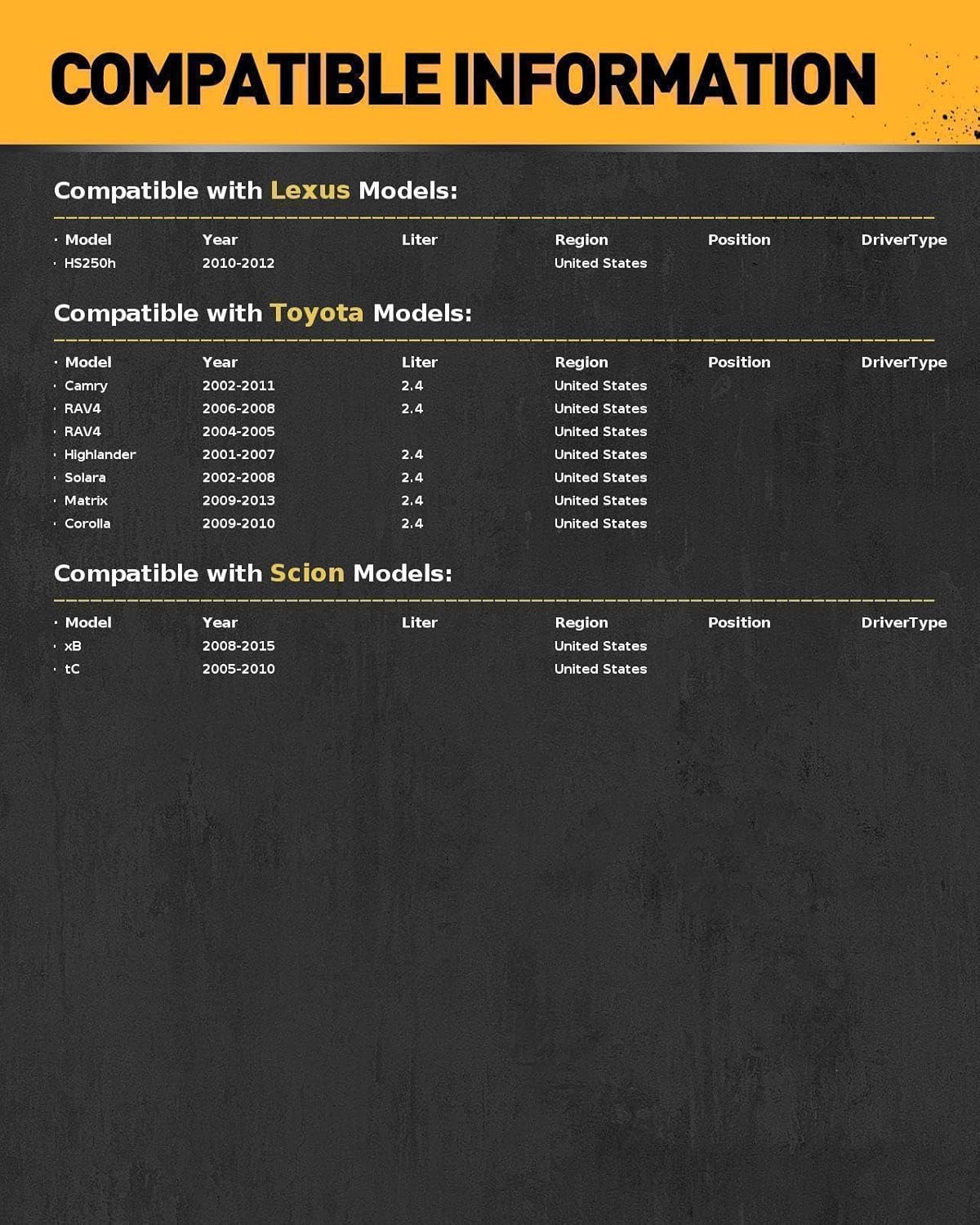 SPECIFICATION:Fitment Type: Direct ReplacementOE/OEM :HS 26323 PT,26323 PTFITMENT : 2002-2011 Camry2004-2008 R-A-V-42008-2015 xB2005-2010 tC2001-2007 Highlander 2.4L2009-2013 Matrix2002-2008 Solara 2.4L2010-2012 HS250h2009-2010 Corolla Note : Please enter your vehicle's year/make/model/Trim/Engine and check the fitment in "Your Garage" Package Includes:Cylinder gasket*1exhaust gasket*1glue*1interface gasket*1valve chamber gasket*1valve oil seal*16seal*6paper ring*1small iron gasket*1paper gasket*1throttle body gasket*3
