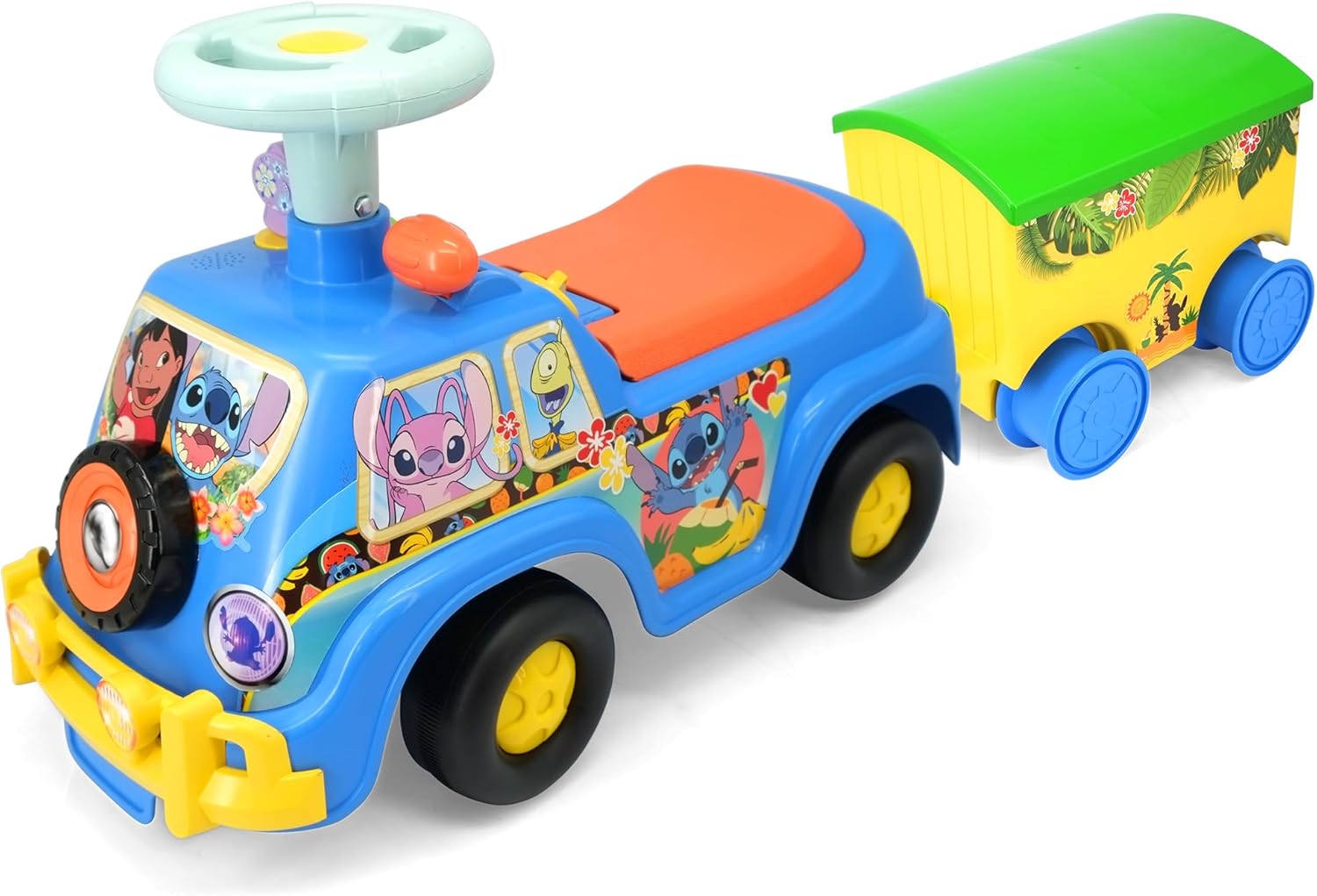 KIDDIELAND: LIGHTS N' SOUNDS BEACH CAR WITH TRAILER - STITCH - Get ready for an exciting beach adventure with the Kiddieland Lights N’ Sounds Beach Car with Trailer – Stitch! This adorable, officially licensed Disney Stitch ride-on is designed to bring endless fun and imaginative play to little ones. With flashing lights and playful sounds, toddlers will love cruising along on their next seaside-inspired journey. The interactive dashboard is packed with engaging activities, allowing kids to turn the key, shift gears, press buttons, and spin dials for an immersive driving experience. The steering wheel lets them take control of their adventure, while the cheerful sound effects make every ride even more exciting. Plus, the seat lifts up to reveal a built-in storage compartment, perfect for keeping small toys or treasures safe. Adding to the fun, this ride-on comes with a beach-themed trailer packed with accessories, including a mini pail, shovel, fork, and two sand molds, providing everything kids need for a creative and playful day at the beach—whether real or imaginary! Parents will appreciate the safe and durable construction, ensuring a sturdy and reliable ride for hours of entertainment. Designed for children aged 12 months and up, this delightful Stitch beach car ride-on is powered by two AA batteries (included), so the fun can begin right out of the box! INCLUDES: 1 Stitch Beach Car Ride On, 1 Trailer, 1 Sand Bucket, 2 Sand Molds, 1 Fork, and 1 Shovel.