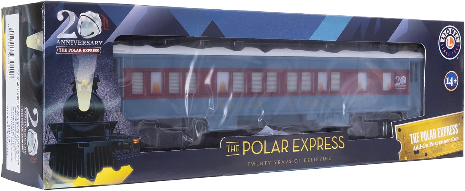 | Additional Features | Compatible with Lionel O Gauge, Includes The Polar Express 20th Anniversary logo, Interior LED illumination, Operating couplers, Snow-covered roof with footprints, Window silhouettes |