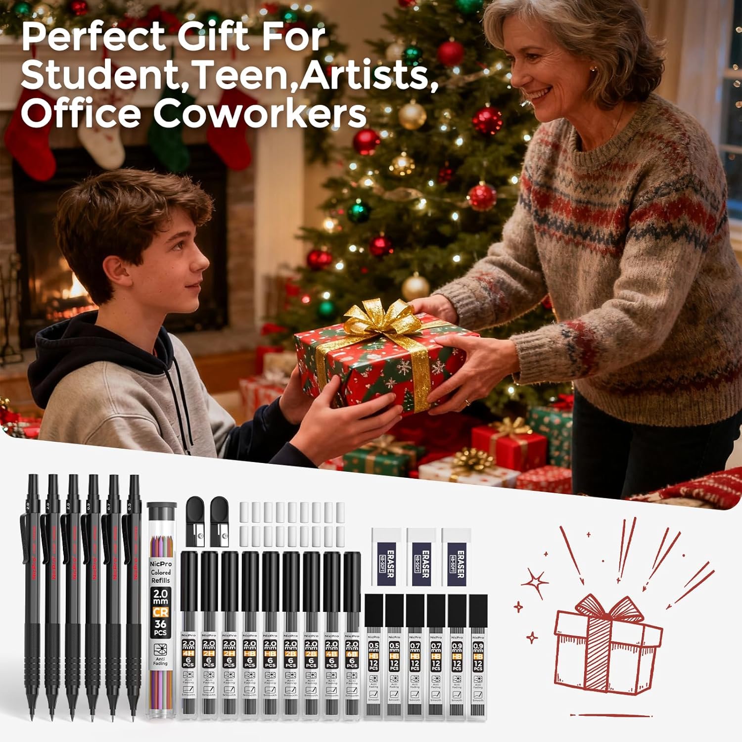Nicpro 30PCS Black Metal Mechanical Pencil Set in Leather Case, Art Drafting Pencil 0.5, 0.7, 0.9 mm, 2mm Lead Pencil Holders for Sketching Drawing With 16 Tube (6B 4B 2B HB 2H 4H Colors)Lead Refills