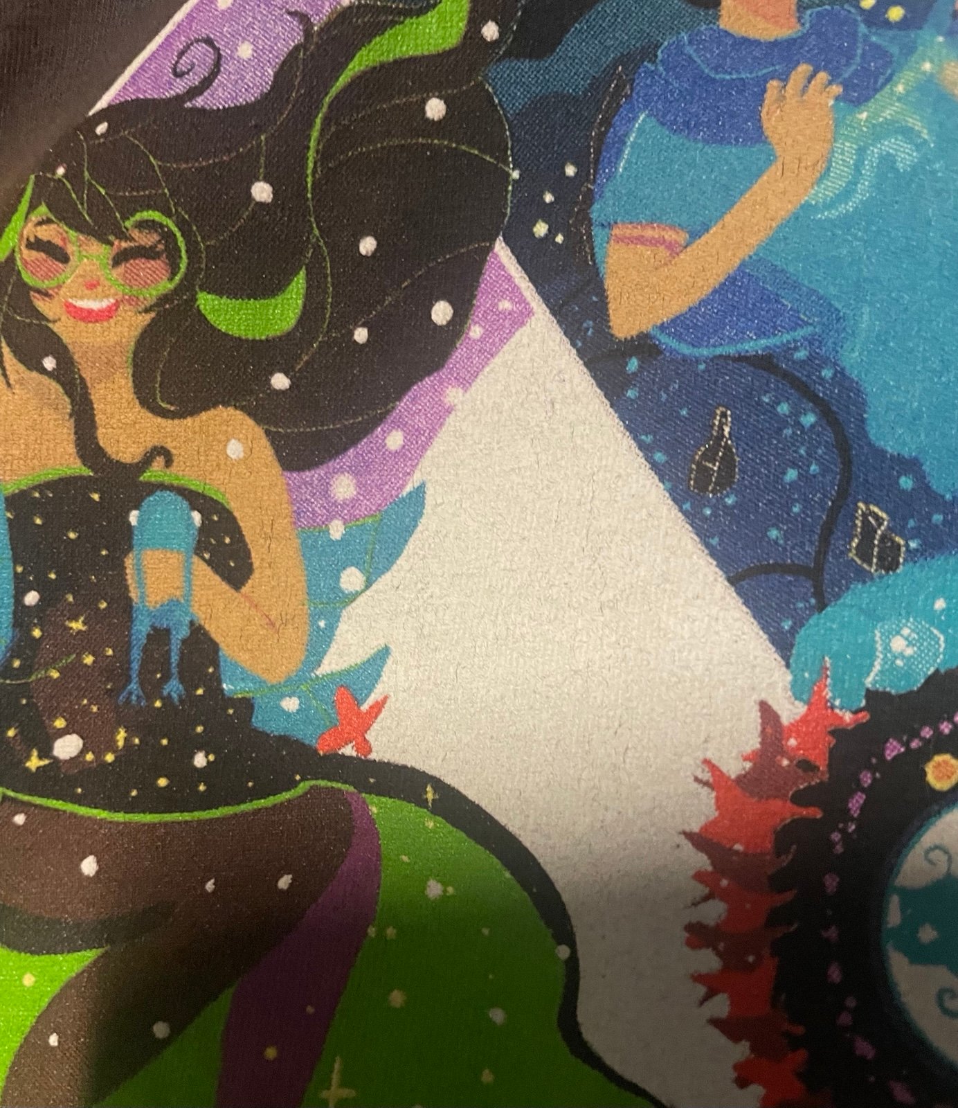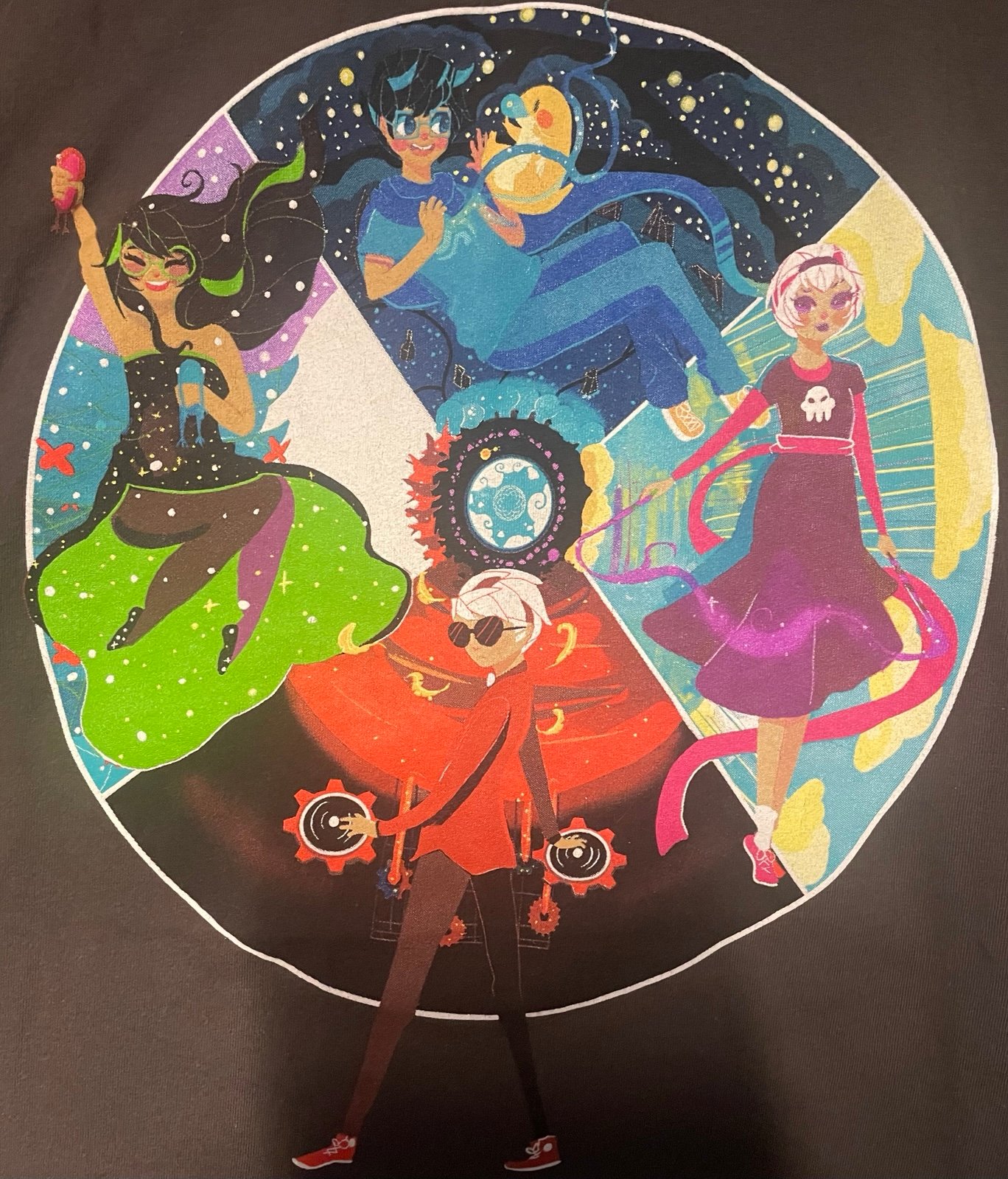 A vibrant and fun Homestuck shirt featuring John Egbert, Rose Lalonde, Dave Strider, and Jade Harley each in their respective lands! This is from WeLoveFines glory days and is hard to come by now. No cracking on the graphic whatsoever which is a miracle considering its age.