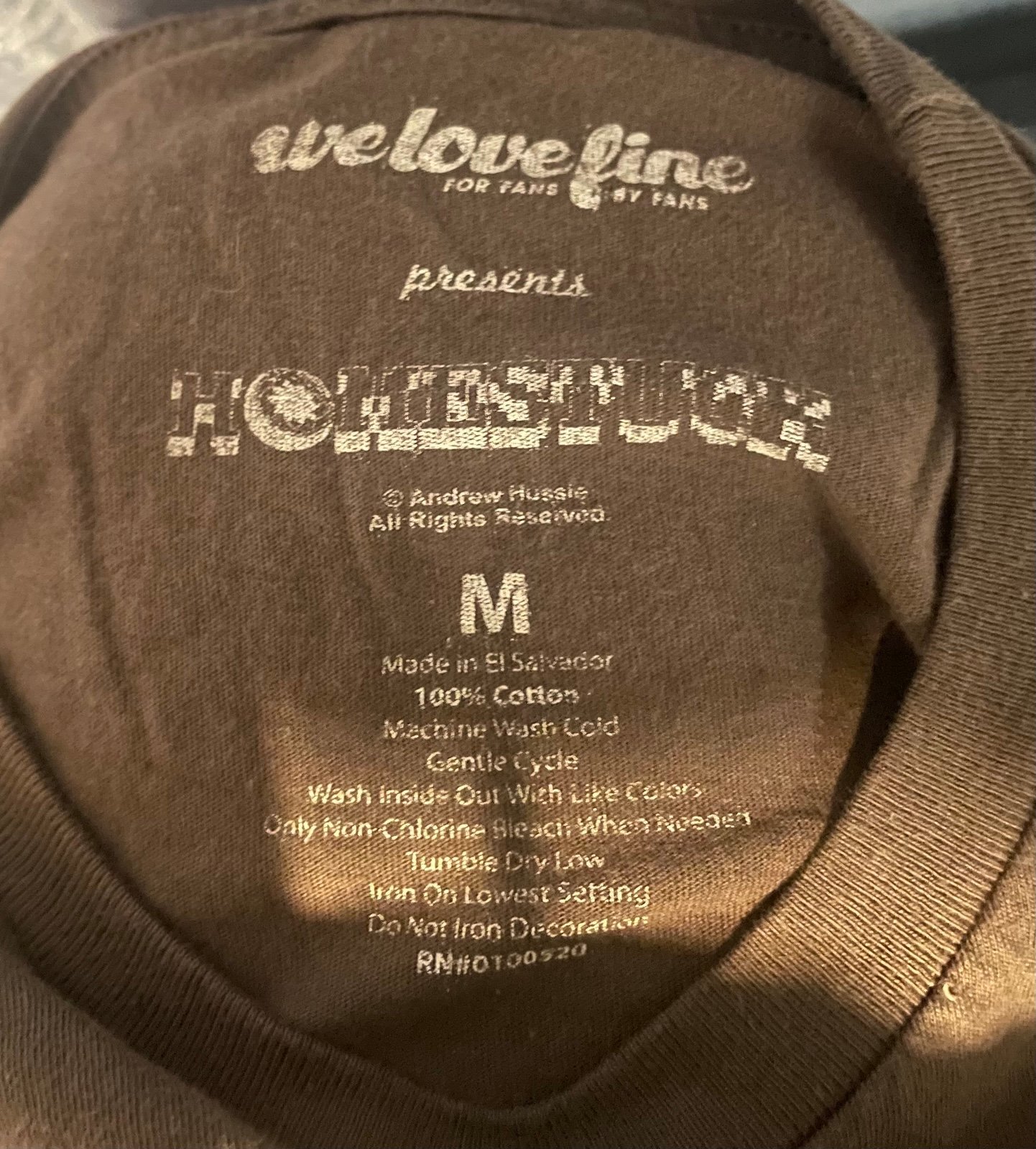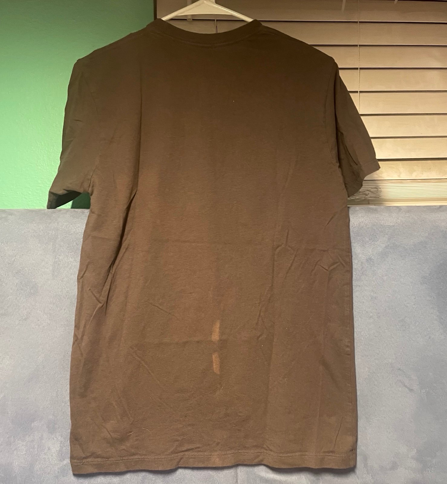 It does have a small bleach(?) stain on the back, it was like that when I received it. Shown up close in pictures 4 and 5, my hand for scale. Could be hidden if you wore a jacket or tucked in the shirt. Might be a way to remove it too, although I’m not sure?