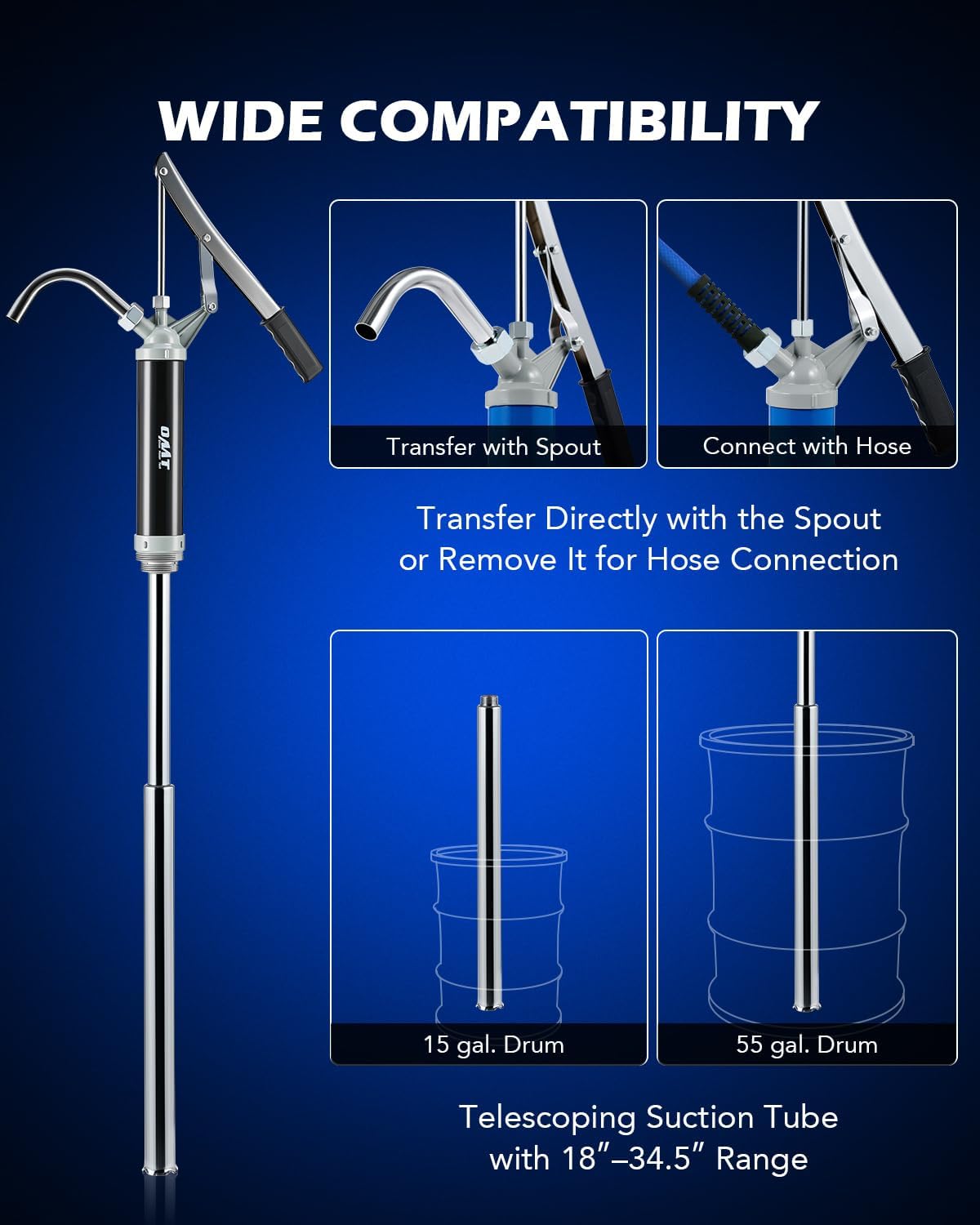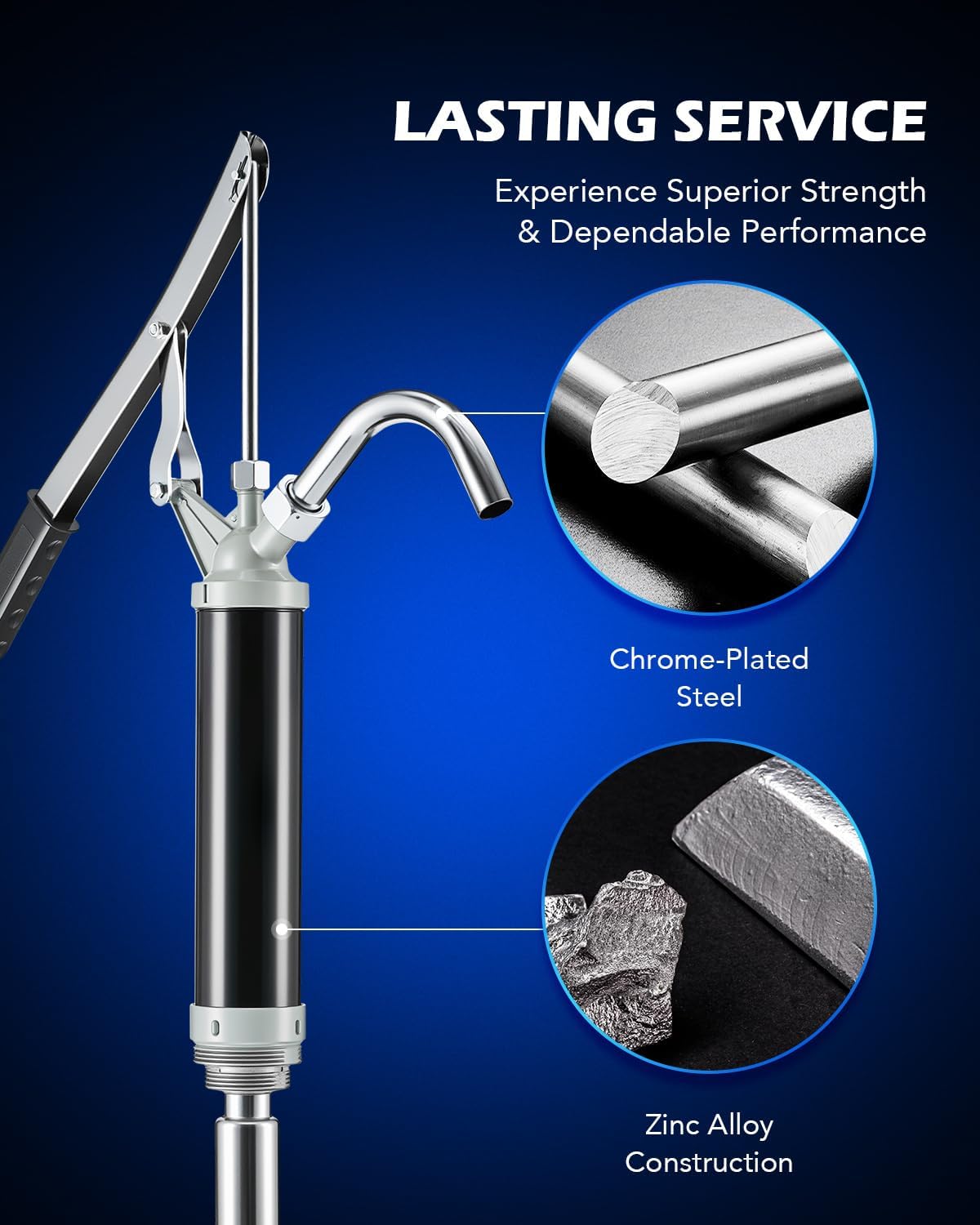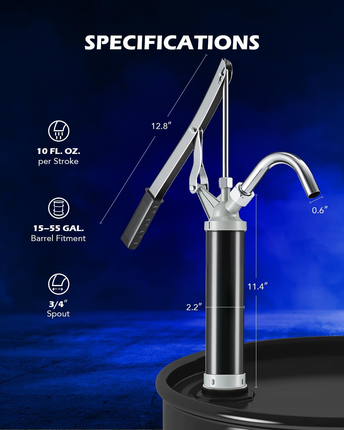 | Included Components | 1x 3/4" Spout, 1x Lever Handle, 1x Telescoping Suction Tube, 1x Pump Body, 1x M5 Nut, 1x M5 Bolt, 2x Wrenches, 1x Thread Seal Tape, 2x Gloves, 1x Instructions |