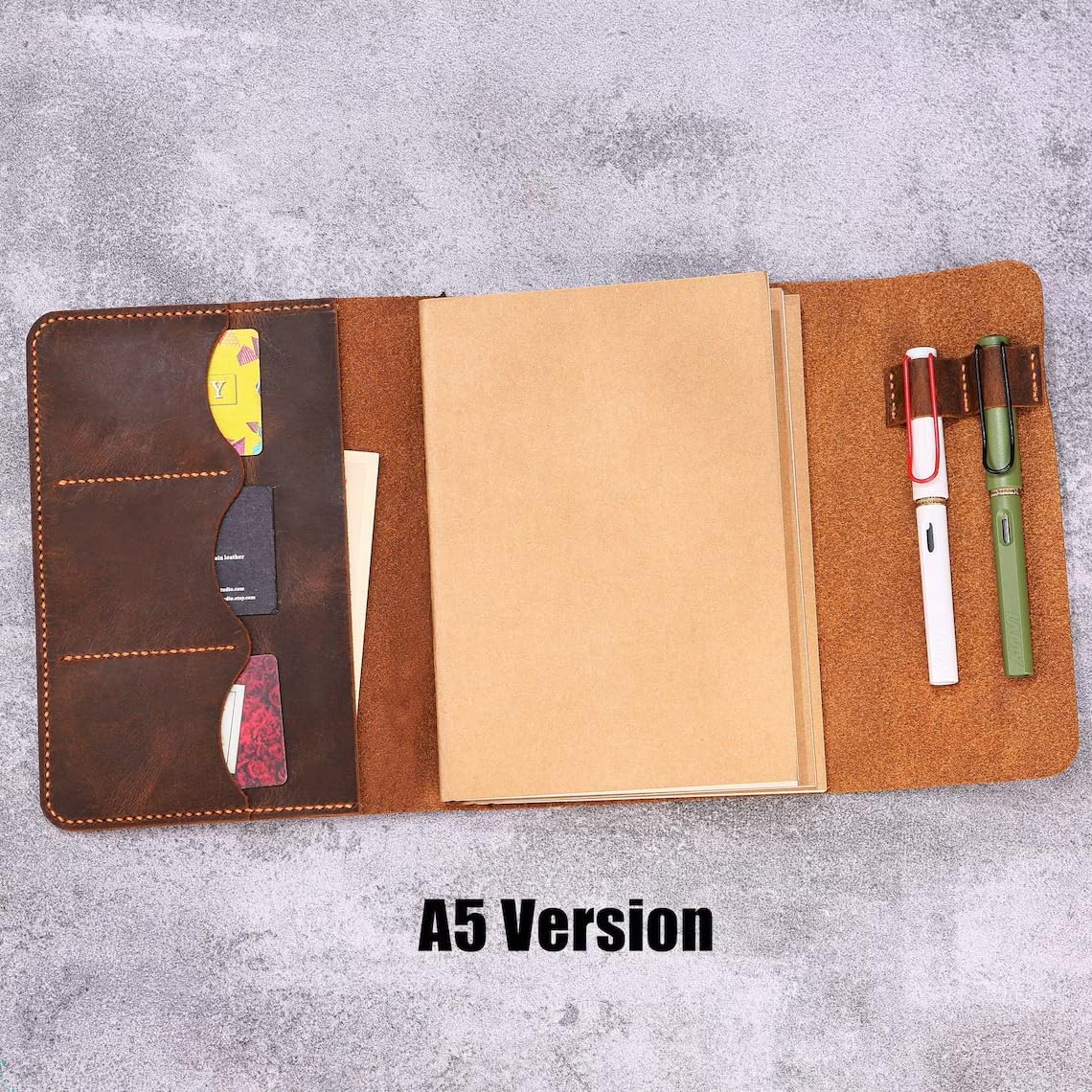 A leather journal cover should become more personal with every use. This handmade full grain leather journal cover is designed to evolve over time, developing a natural patina shaped by your travels, notes, and everyday routines. The leather’s rich grain and vintage character create a tactile writing experience that feels authentic and timeless. The trifold design combines simplicity with functional organization. Card slots keep essential items within reach, while integrated pen loops allow you to carry your favorite writing tools wherever you go. Whether used for journaling, sketching, planning, or professional note-taking, the refillable structure ensures long-term usability without replacing the entire cover. Personalization adds an extra level of individuality. Engrave your initials, artwork, or logo to create a journal that reflects your style. Available in A5 and A6 sizes, this leather cover adapts to different writing preferences while maintaining a compact and practical everyday carry format.