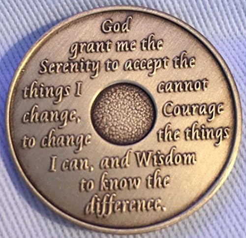Set of 12 Metal Alcoholics Anonymous AA Medallions Includes 24hrs & Months 1-11 Raised lettering & graphics Front says To Thine Own Self Be True & Unity Service Recovery and has the given month. Back has the Serenity Prayer Made In The USA