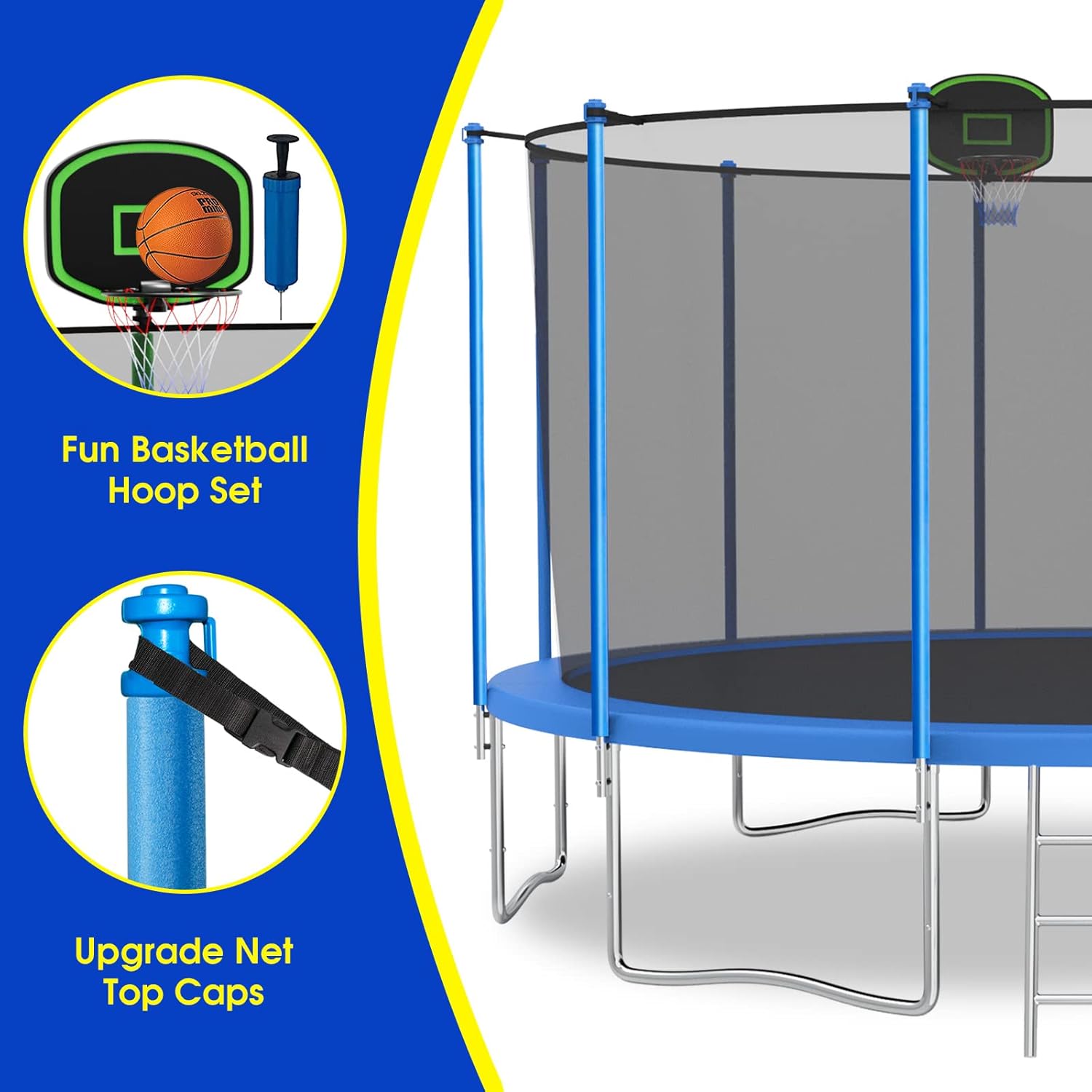 Features:✔Sturdy Trampoline for Kids and Adults✔Jump for Fun and Health✔Indoor and Outdoor Trampoline➤Easy to Assembled➤Higher Quality& Super BounceSpecification:Diameter:12FT / 14FT / 15FT/16FTMax Load Weight:800 lbs/1200 lbs/1400 lbs/1500lbsSprings Quantity: 12FT: 72PCS 14FT: 80PCS 15FT: 96PCS 16FT: 108PCSFrame Construction: Galvanized SteelJump Mat: UV protected PolypropyleneSafety Net: PolypropyleneSpring Pad: UV ResistantSprings: Weather-resistant Galvanized SteelAdditional Configuration: Ladder and Basketball HoopLevel of Assembly: Full Assembly NeededPacking list:Spring Cover Pad x 1PCSJumping Mat x 1PCSafety Enclosure Net x 1PC Steel Pipe: 12pcs Springs: 108PCS