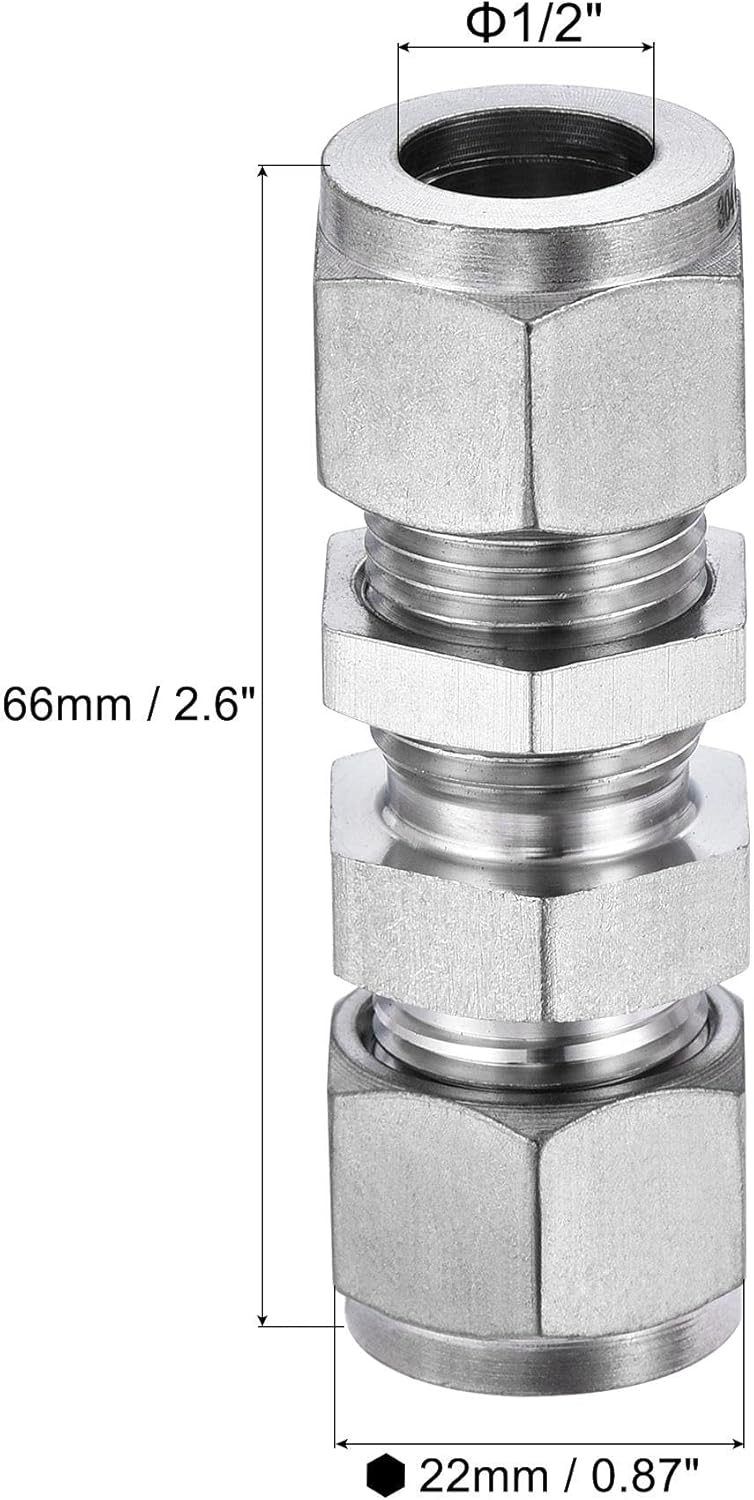 Features:Made of 304 stainless steel, with high strength and corrosion resistance, rustproof.Bulkhead union fitting allows tube connection on either side of barrier.Use with copper, brass, aluminum, or plastic tubing.Widely used to connecting pipes or fittings of different types such as garden hose, water pipe, oil tube, fuel pipe, etc.Specifications: Material: 304 Stainless SteelColor: Silver ToneFit for Tube OD: 1/2"Male Thread Size: M18x1.5mmHex Width: 22mm / 0.87"Total Length: 66mm / 2.6"Package Content:1 x Compression Tube Fitting