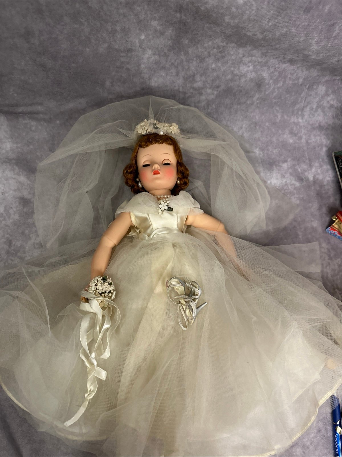The Vintage Madame Alexander Elise Bride Doll from the 1950s is a 15-16" collector's item featuring a light brown wavy hair, brown eyes, and a fair complexion. This original and licensed doll by Madame Alexander is part of the Bridal Wedding franchise and is recommended for all ages. Made of hard plastic and vinyl, this girl doll is a classic representation of the fashion and beauty theme of the time period. The set includes the doll, shoes, earrings, bouquet , garter belt and vail. And is a perfect addition to any doll and doll playsets collection.
