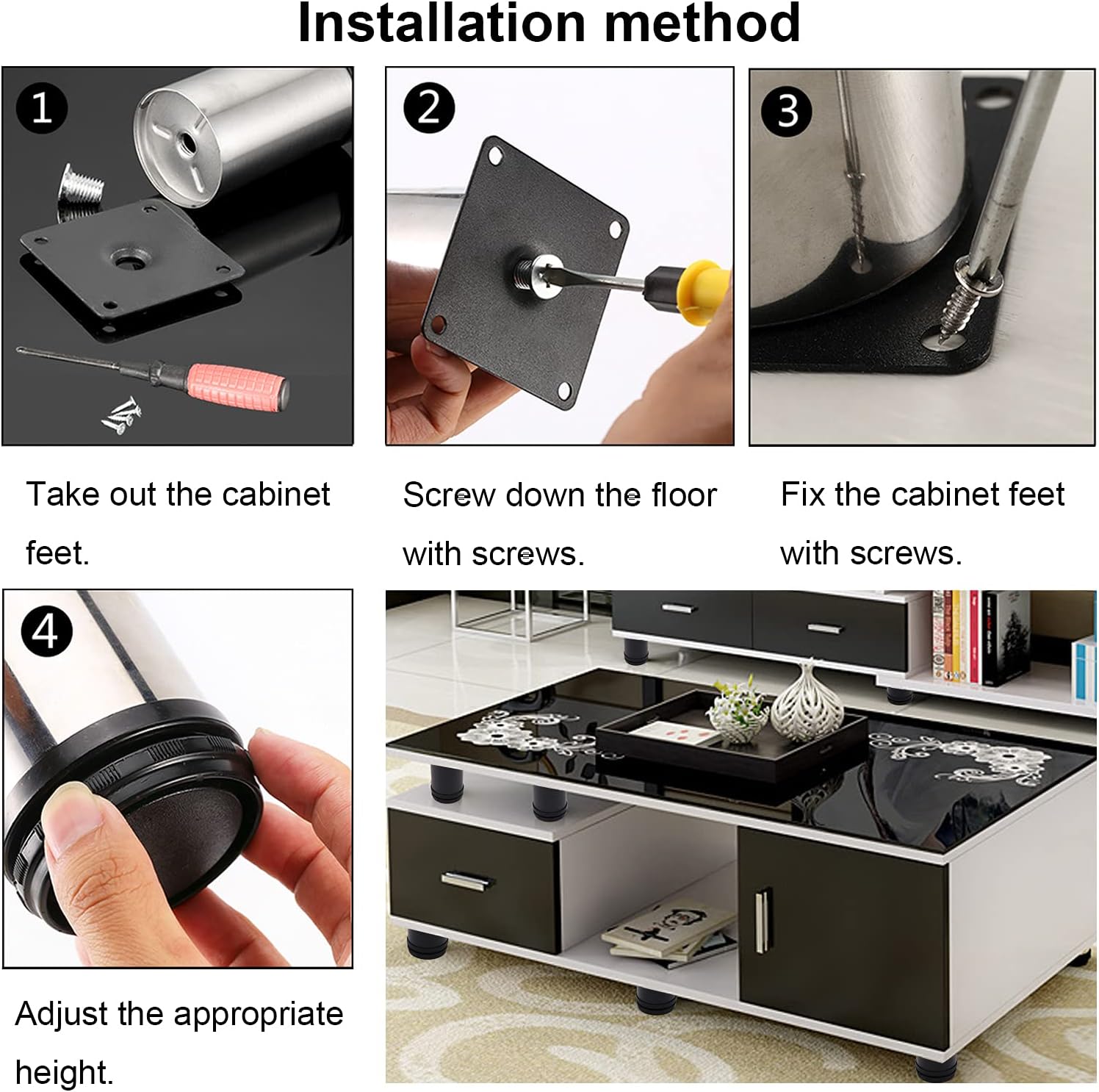 • Application:Good accessories for DIY furniture, cabinets, shelves,and come with screws.The adjustable cabinet legs are crafted with 4 predrilled holes at the bottom bracket for quickly and easily to install in a few minutes.